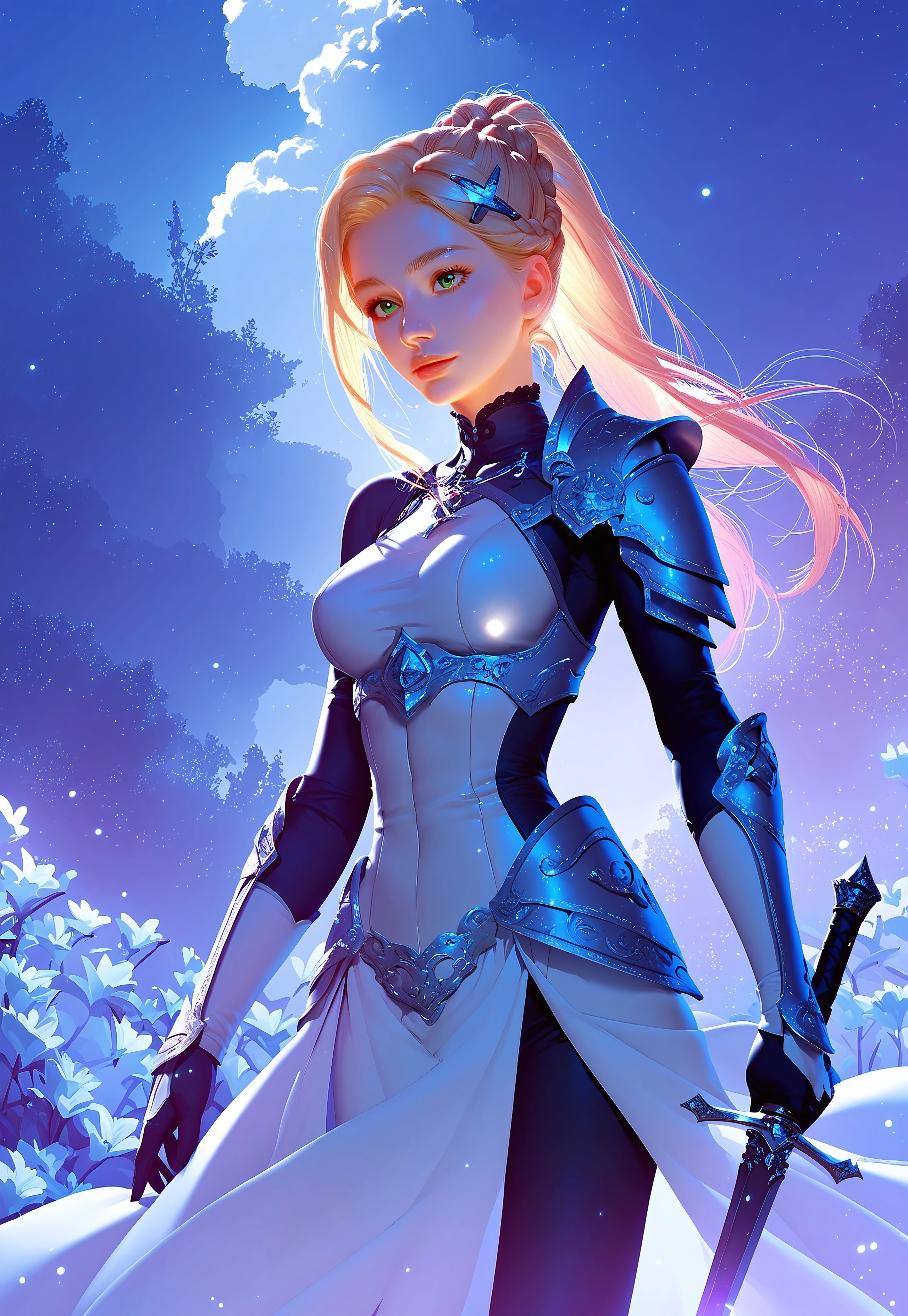 (score_9, score_8_up, score_7_up, score_6_up, score_5_up, score_4_up, scenery, Masterpiece), BREAK, long hair, green eyes, blonde hair, beautiful face, hair ornament, ponytail, braid, x hair ornament, gloves, armor, bodysuit, shoulder armor, armored dress, standing up, outdoors, detailed background, night, moonlight, high detail, partially illuminated, warm light, eye contact,