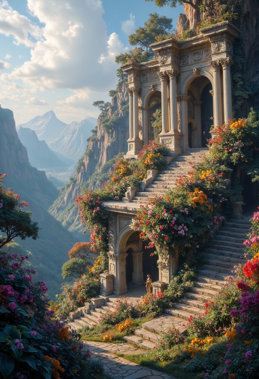The image depicts a serene, fantastical landscape with ancient architecture. The setting is a combination of a lush, colorful garden with classical architecture, specifically reminiscent of ancient Greek or Roman temples. The architecture includes grand columns, stone steps, and ornate details typical of ancient classical structures. The building seems to be integrated into the landscape, suggesting a harmonious blend of nature and human creation. The scene is rich with flora, with vibrant flowers and greenery surrounding the architecture, enhancing the ethereal quality of the location. There are mountains in the background, adding depth and a sense of grandeur. The atmosphere is serene, almost heavenly, with a clear sky and soft lighting that suggests either dawn or dusk, adding to the mystical feel. The mood conveyed is peaceful, majestic, and slightly otherworldly, as if this place exists in a realm where time moves differently or where magic is commonplace.