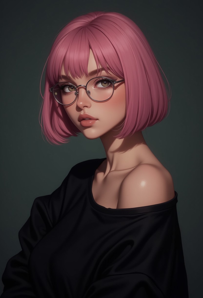 a cute woman, pink hair bob, wearing an oversized black top with long sleeves, bare shoulders, visible collor bone, thin-rimmed round glasses, front view, (hi-top fade), (dark theme:0.9), soothing tones, muted colors, high contrast, (natural skin texture, hyperrealism, soft light, sharp), close up, closed mouth, contemplative expression