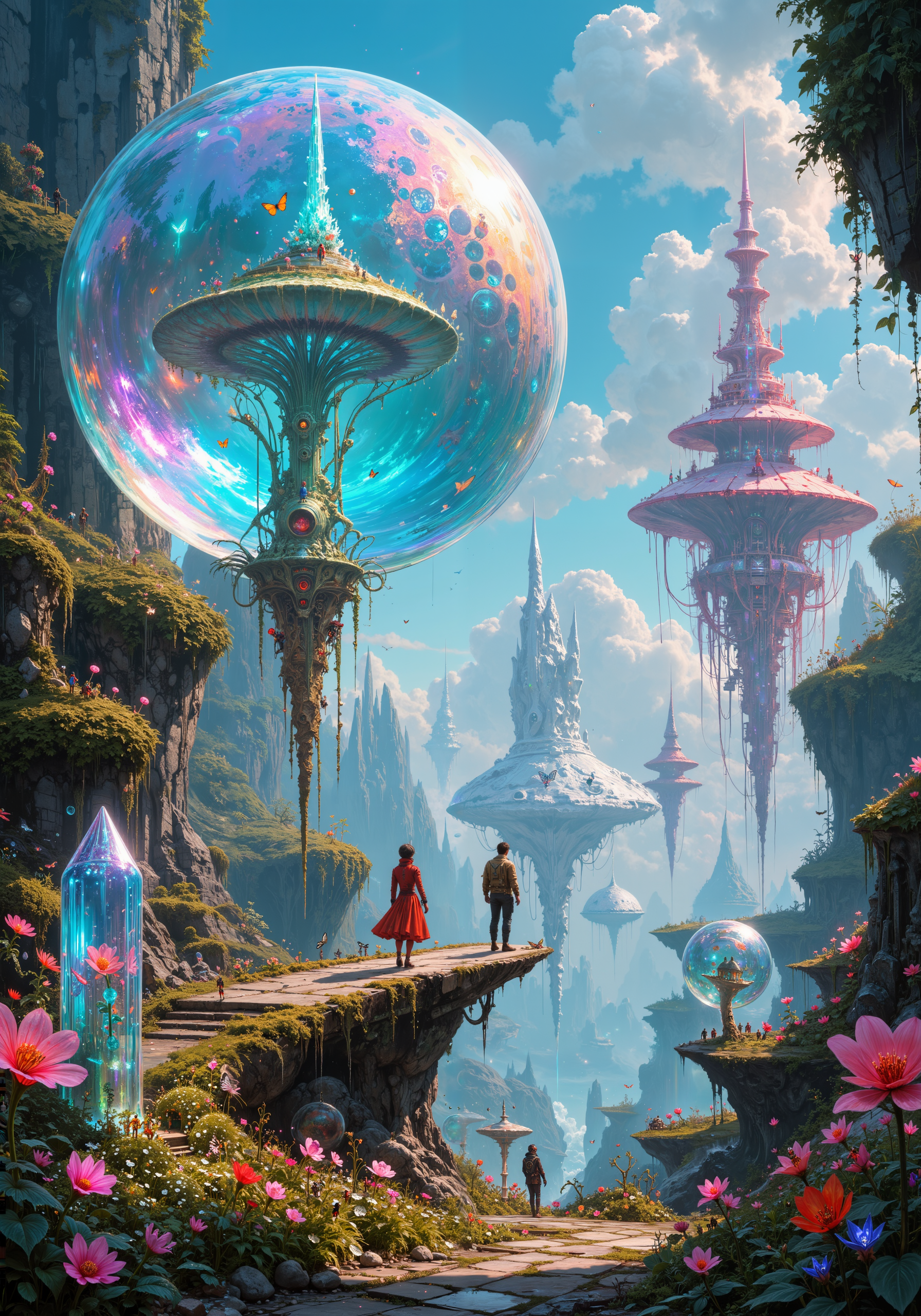 Colossal iridescent soap bubbles float majestically in a whimsical garden, their translucent surfaces reflecting rainbows and tiny worlds within. Miniature explorers in vibrant steampunk attire navigate delicate bridges made of flower stems between the bubbles. Gargantuan glowing jellyfish-like plants with bioluminescent tendrils sway gently, their bell-shaped caps providing shelter to the tiny inhabitants. Crystalline formations sprout from the ground, refracting light into prismatic patterns. Mechanical butterflies with clockwork wings flit between oversized dewdrops balancing precariously on giant blades of grass. The sky above is a swirling tapestry of pastel hues, dotted with floating islands covered in lush foliage. Intricate, fantastical 8k digital illustration, hyper-detailed, dreamlike atmosphere, soft ethereal lighting. <lora:FluxMythAn1meL1nes:0.6> <lora:style_of_Norman_Ackroyd_FLUX_100:0.6> <lora:artisketchyfs-v02:0.3> <lora:flux_dev:1>