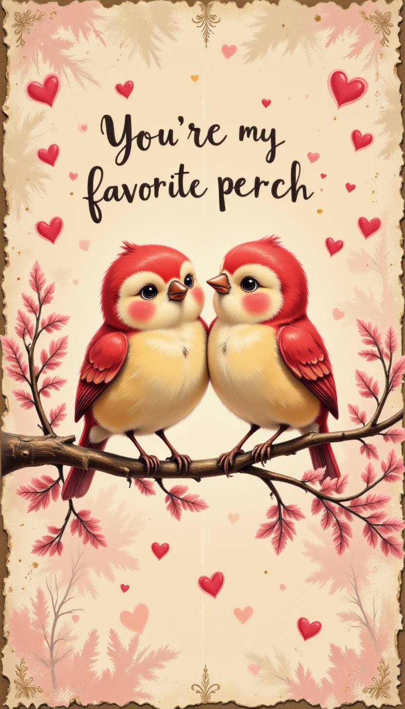 pinkvintagevalentine, Two adorable birds sitting close together on a branch, surrounded by tiny pink hearts, with the message âYouâre my favorite perch.â