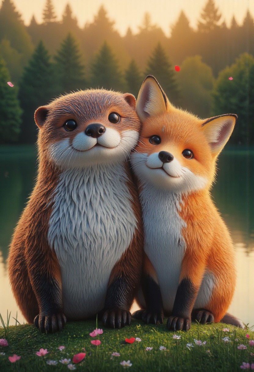 A realistic, intimate close-up of a loving otter and a shy fox, their faces nestled together in a tender embrace. The otter's round, affectionate eyes gleam with warmth, its damp whiskers glistening in the soft golden light, while the fox’s fluffy ears twitch slightly, its gaze filled with quiet adoration. Their fur is bathed in a gentle glow, reflecting the rosy hues of the setting sun. Tiny pink flower petals drift lazily through the air, some landing on the otter’s sleek fur and the fox’s bushy tail, while others swirl gently around them, carried by the soft evening breeze. They sit close together on a mossy riverbank, surrounded by delicate wildflowers and the gentle murmur of a babbling brook. The distant forest is blurred into a dreamy haze of soft greens and warm sunset tones, enhancing the romantic atmosphere. The light, golden and warm, filters through the trees, casting delicate highlights on their fur and creating a soft gradient of shadows that accentuates every intricate detail of their features. The scene captures a fleeting, tender moment of love and devotion, as if the world itself has paused to honor the quiet, heartfelt connection between these two soulmates on a serene Valentine’s Day evening.