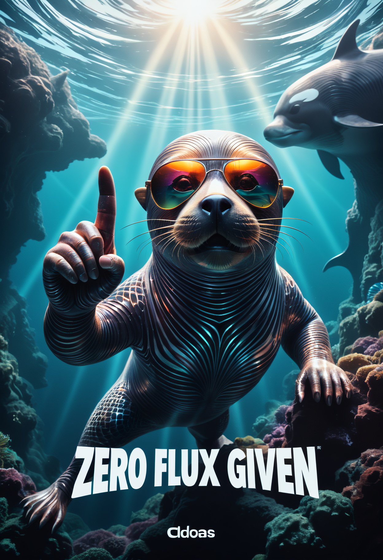 Photo of a sealion made out of fractangles underwater fleeing an orca whale. the sealion is wearing reflective aviator sunglasses. the sunlight on the water creates a fractal patern above. The scene is funny and dramatic as the sealion shows the orca a his middle finger with the mood of an action movie poster, text "Zero Flux Given". <lora:Fractangles - Flux_epoch_20:1>
