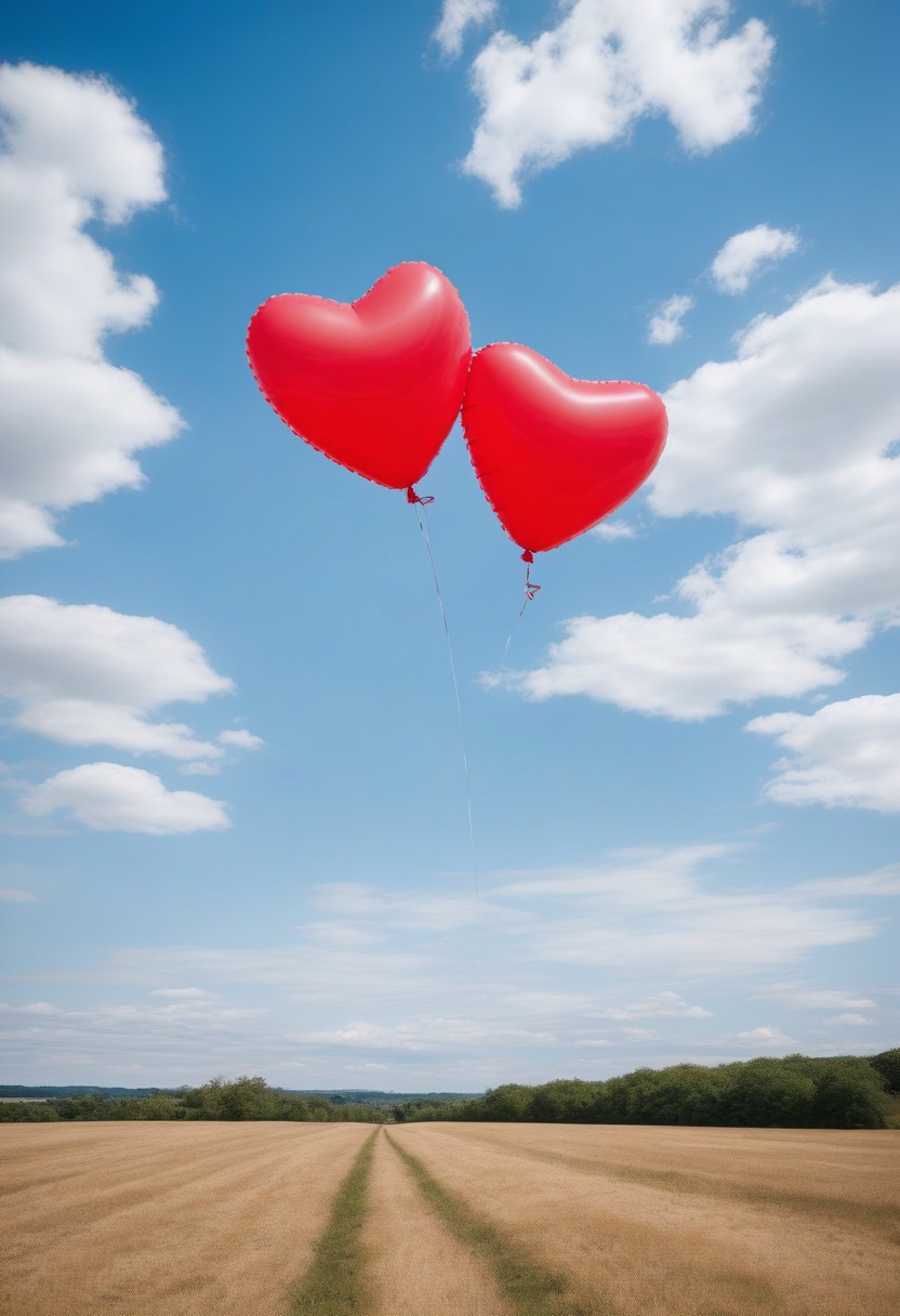 A single red Heart-shaped balloons, outstretched arm, blue sky, cloud,