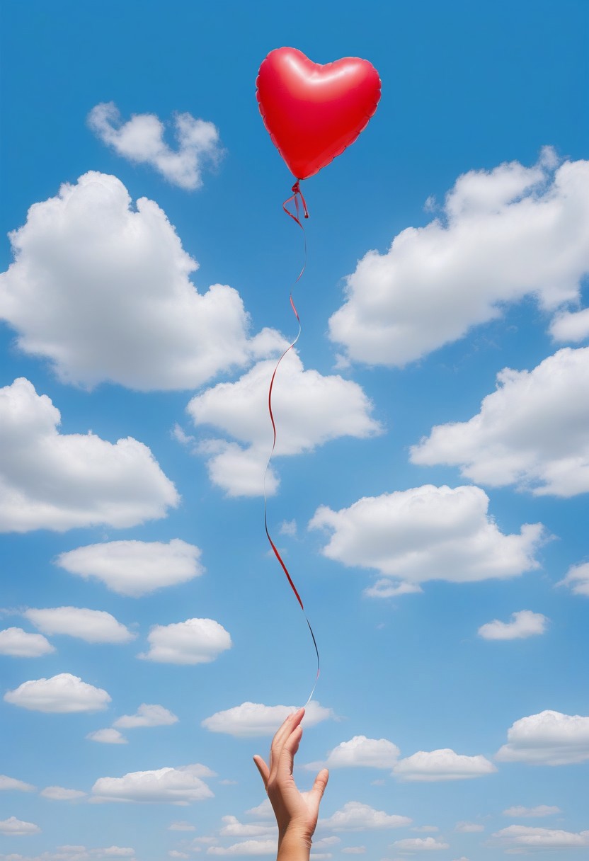 a Heart-shaped balloons, outstretched arm, blue sky, cloud,