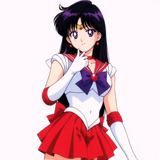 standing tall in a red pleated skirt and a white sailor top. A purple bow rests on the chest, with one hand gently touching the chin in thought., Mar$. Character with raven-black hair and a calm yet intense expression. Wearing a red and white sailor uniform with a structured purple bow on the chest. The posture is upright