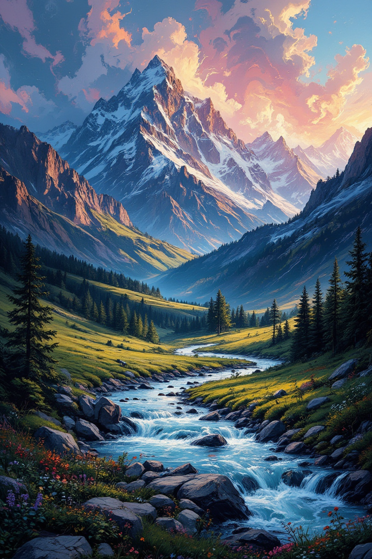 Spooky Art Drawing. This is a vibrant and detailed digital artwork of a mountainous landscape. The scene features: Mountain Ranges: Snow-capped mountains dominate the background, creating a majestic backdrop. Sky and Clouds: The sky is filled with dramatic clouds in shades of pink and orange, suggesting either sunrise or sunset. River: A flowing river runs through the foreground, bordered by rocks and lush greenery. Vegetation: Dense forests cover the lower slopes, transitioning into grassy fields near the riverbank adorned with wildflowers. The use of vivid colors and dynamic lighting enhances the natural beauty and gives the painting an almost surreal quality. The composition draws the viewer's eye from the rushing water in the foreground to the towering peaks beyond.,aidmafluxpro1.1