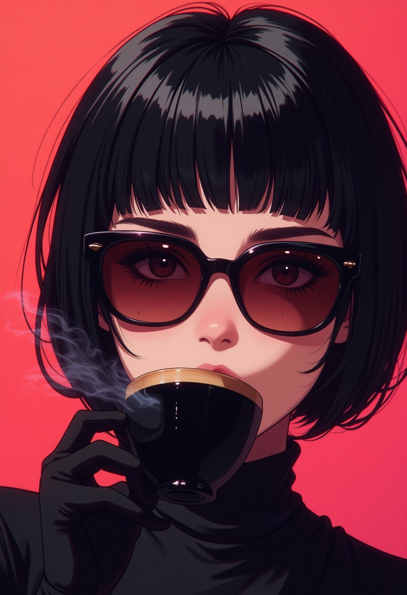 (8k resolution, absolute masterpiece, ultra detailed, best quality, masterpiece, colorful, highest detailed), (intricate details), (hyper-realistic), (dynamic angle), 1 girl, solo, short black hair, bob cut, large sunglasses on had, smoking a ciggeratte, closeup, face focus, face, coloured background, wearing a skin tight black turtle neck,