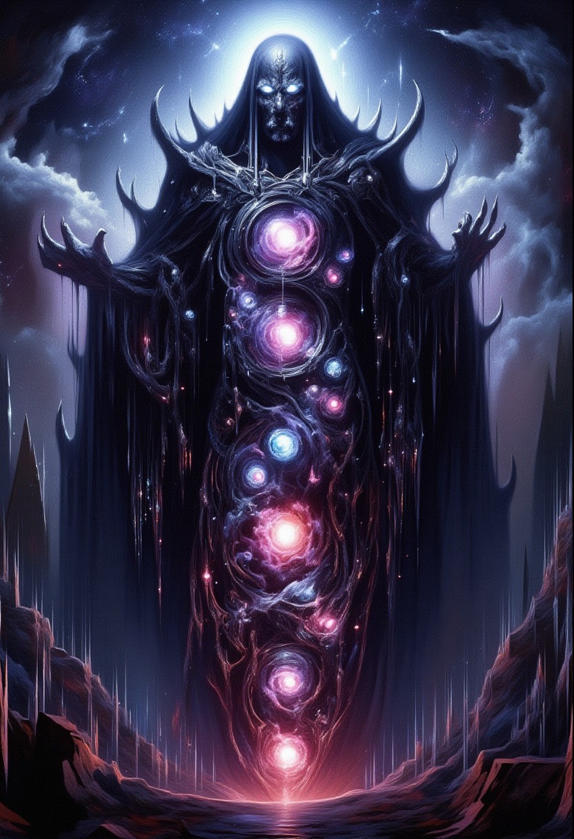 A massive dark cosmic silhouette demonic god of knowledge wisdom and madness:1, chaos god, lord of the abyss, Multiple glowing eyes:3, cosmic, dark energy , glowing eyes, extra eyes, horror \(theme\) ,( dark silhouette:1.2), magic, glowing entropymagic, fantasy, dissolving, decay<lora:dark_fantasy_flux:0.83> <lora:FredFraiStyle-FLUX-Share:0.63> <lora:sxz-Dark-Fantasy-v2-Flux:0.33> drkfnts style, CosmicStyle