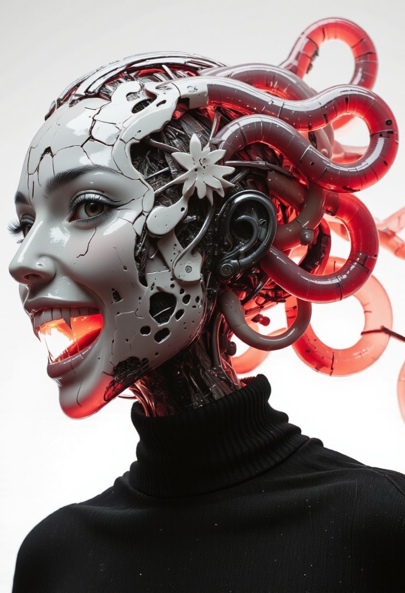 monochrome manga sketch, A stark black-and-white macro close-up of a translucent robotic head radiating a haunting, dystopian allure, its porcelain-like surface devoid of color except for faded, translucent red highlights glowing faintly with a ghostly intensity. Intricate, etched designs resembling cracked floral patterns and fragmented koi fish spread across the ceramic shell, their details stark against the monochrome tones. Beneath the translucent facade, flower-like mechanical components and delicate wired circuits gleam faintly, illuminated in the faint red glow, like secrets bleeding through glass. Her translucent, snake-like hair coils and undulates in the air, its strands alive with eerie fluidity, each one glowing with the same faded red hue, evoking a sense of quiet menace. She gazes directly into the camera, her soft, mysterious smile laced with a cold, dystopian knowingness, as if she understands the futility of hope. Backlit by a dim, diffused light, the translucent red highlights pulse weakly, casting fragmented reflections onto her cracked and weathered surface. A grainy cinematic texture adds to the desolate, dystopian atmosphere, blending ancient mechanical decay with an otherworldly sci-fi allure.