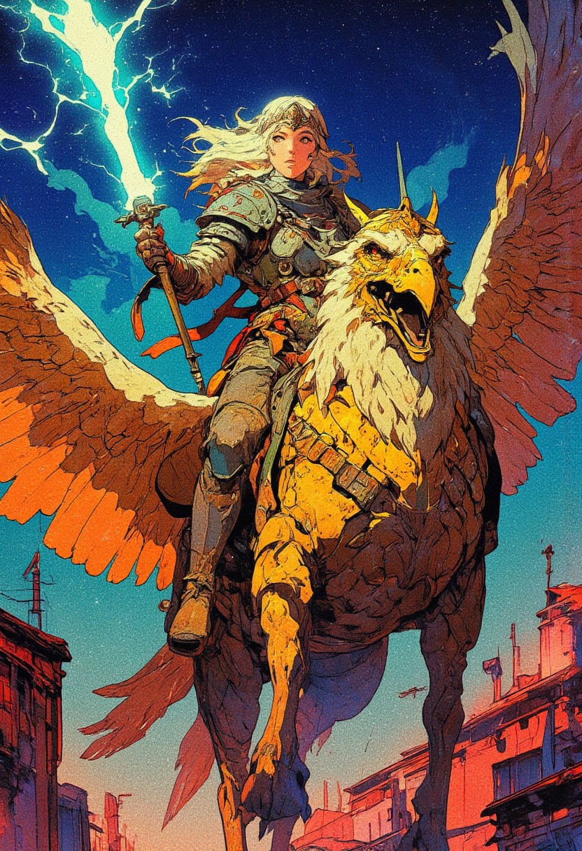 (A highly detailed) (up to down view) Fierce woman warrior, with a tiara on her head, female fantasy armor from the Middle Ages, holding something like a lightning bolt, which glows bright cyan light, she is as if ready to throw it, the woman is riding a fetesian griffin in golden armor, they are in the air, in flight, in the background you can see the stardust evening sky and the buildings of a Ancient village , retro anime, fantasy art , anime, cyberpunk