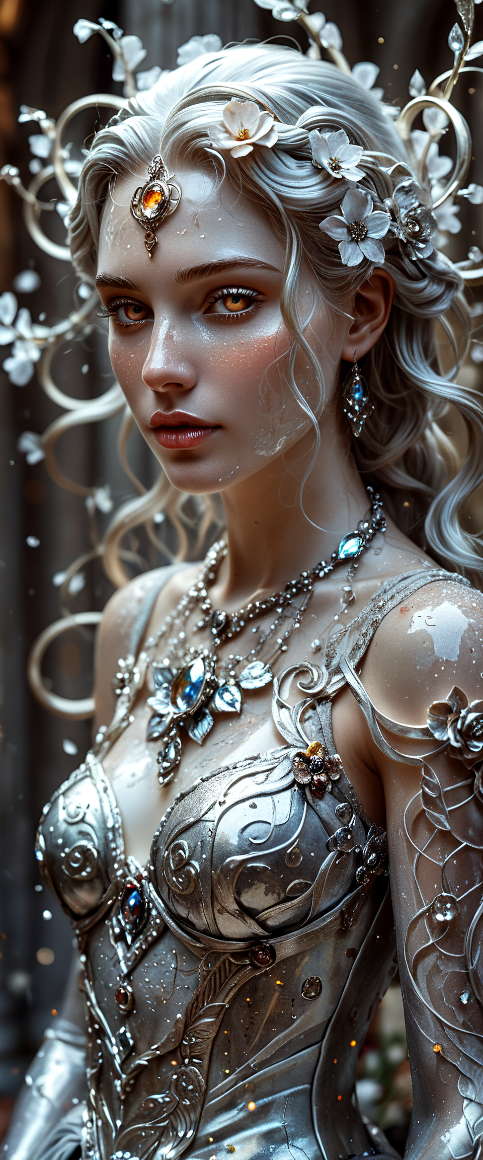 Silver statue of a woman, her skin composed of delicate, textured silver flakes, with chrome and glass flowers intricately woven into her hair, her eyes gleaming with a warm, bluish light, wearing a majestic, windy-blown ornate gown with tattered, silver petals, reminiscent of a dark, dystopian world, her face and shoulders illuminated by a soft, ambient glow, as if radiating an otherworldly energy, in the styles of Royo's dark, mystical realism, Artgerm's hyper-detailed, metallic sheen, and Lovecraft's eerie, atmospheric tension, with meticulous attention to intricate textures, dramatic shading, and a sense of haunting, ethereal beauty.