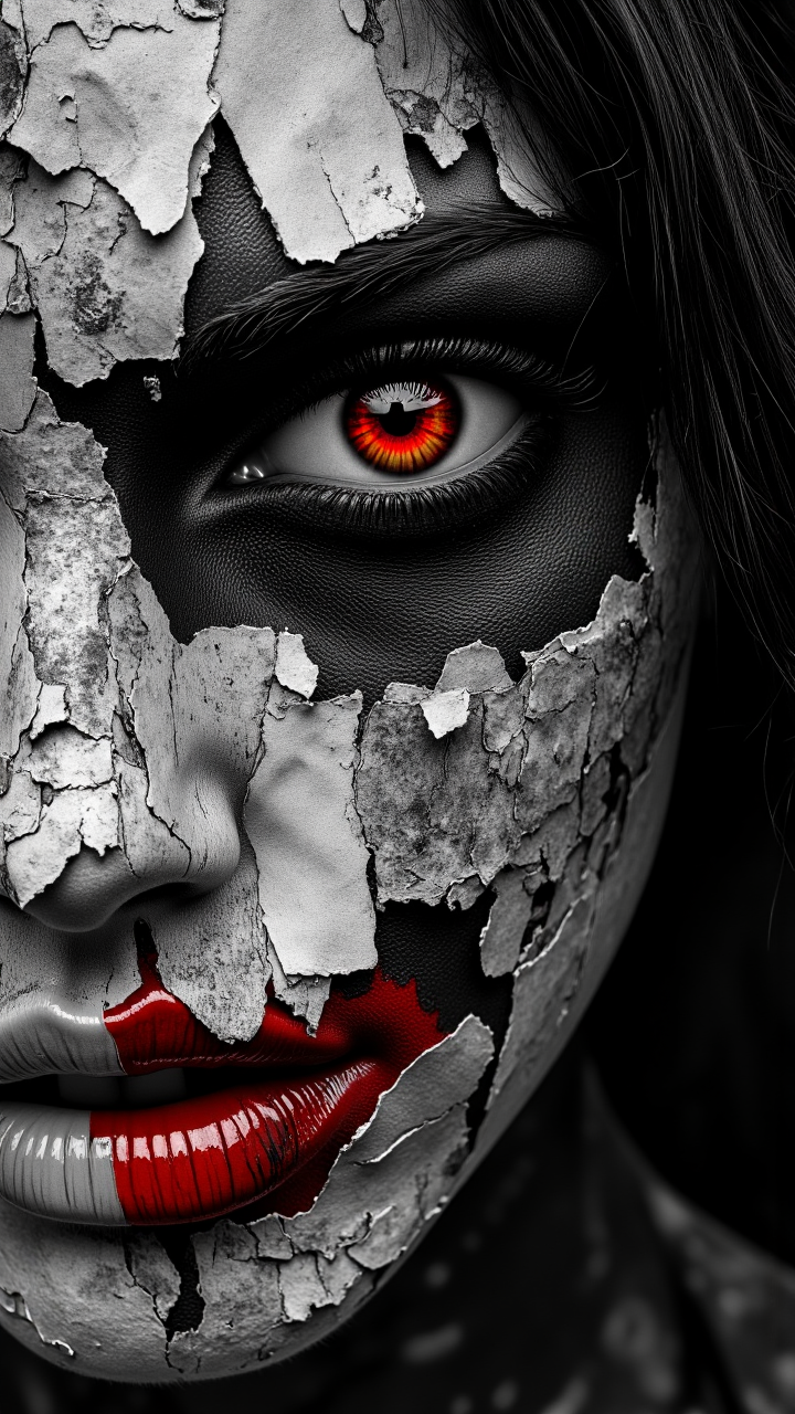artwork featuring a close-up of a woman's face, rendered in a highly stylized, abstract manner. The woman's face is covered in a chaotic collage of torn paper, ink, and other debris, creating a striking, fragmented appearance. Her eyes are the only fully visible feature, with one eye a vivid, intense red and the other a darker, more ominous black. The red eye is particularly striking, with a deep, almost glowing quality that contrasts sharply with the black and gray tones of the surrounding paper fragments.The woman's lips are slightly parted, revealing a hint of teeth, adding to the sense of intensity and danger. Her hair is dark, with some strands visible, though most of it is obscured by the torn paper. The background is a dark, indistinct blur, further emphasizing the subject. The overall effect is one of raw, intense emotion and a sense of chaos and disarray, with the torn paper fragments adding to the feeling of destruction and fragmentation. The style of the artwork is highly expressive and evocative, utilizing a combination of digital painting and collage techniques to create a powerful, unsettling image.,aidmaimageupgrader, aidmaMJ6.1 <lora:aidmaMJ6.1-FLUX-v0.5:0.7> <lora:aidmaImageUprader-FLUX-v0.3:0.4>