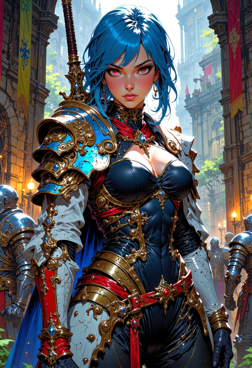Image is a close up digital fantasy artwork featuring a female knight character practicing with her sword. She has pale skin with bright blue hair with light highlights. Her red eyes and a flaming aura in them. She's wearing an intricately designed fantasy corset armor with matching gloves and thigh high boots. Her hands is a large greatsword. The background is of a stone barracks, fantasy castle, armored knights, colorful flags, colorful trees.