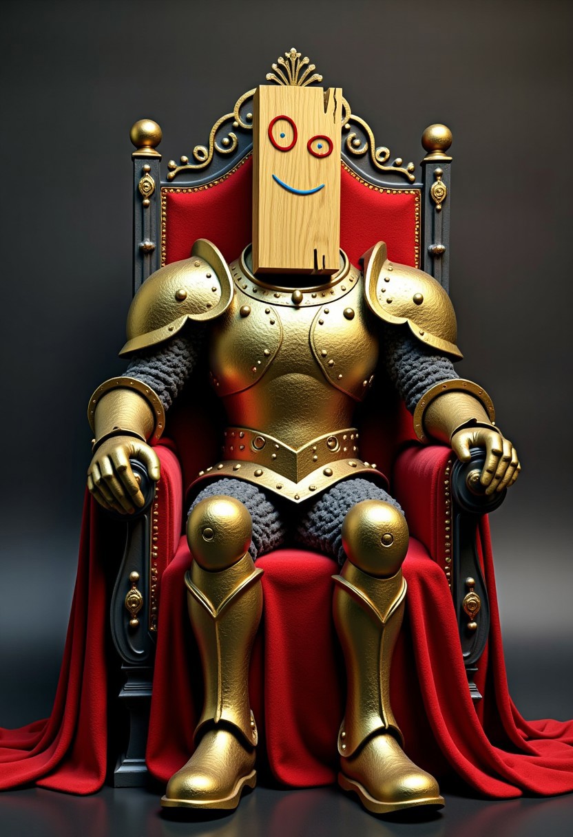 ultra detailed, intricate details, A mighty and imposing king sits on the throne, his shining armor is adorned with fine golden details, the king instead of having a human head has a Plank from Ed, Edd n Eddy seamlessly attached to his neck joint. Plank's wooden face remains eerily expressionless,