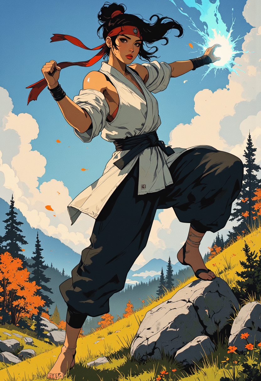Image is a close up digital fantasy artwork featuring an asian female fighter character in a dynamic fighting stance with one leg up. She has tan skin with black hair. She's wearing a sleeveless martial arts robe. with a long red headband. Her hands are wrapped in bandages for boxing. Theres a blue flaming aura around her. The background is of a serene mountainside, grassy field, lush colorful trees, rocks.