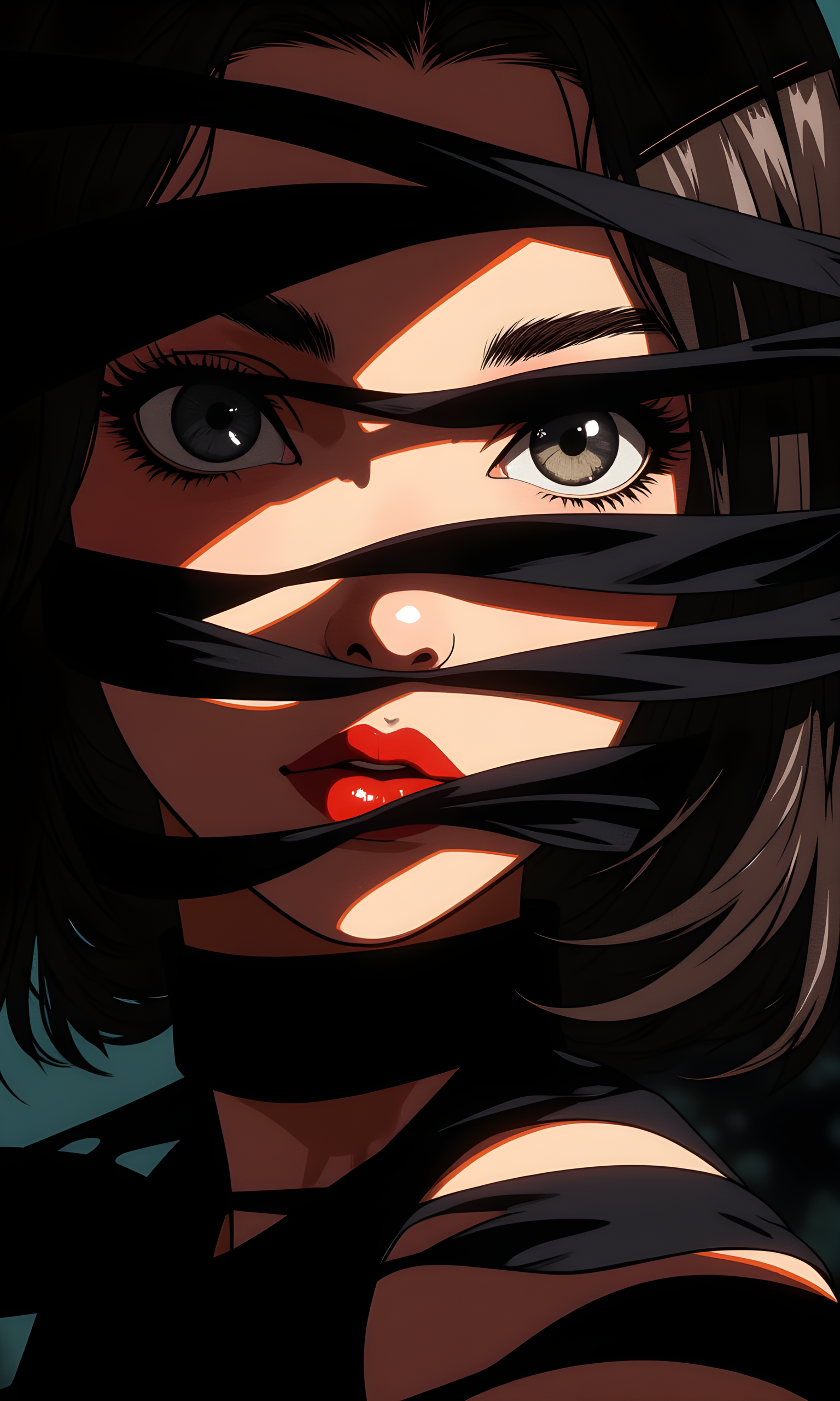 This image is a striking and artistic portrait featuring a woman's face partially obscured by black, ribbon-like strips. The strips are arranged in a way that creates an intriguing interplay of light and shadow, adding depth and texture to the composition. The woman's eyes are visible through the gaps in the strips, drawing the viewer's attention and creating a sense of mystery and allure. Her lips are painted a bold, vibrant red, which stands out vividly against the softer tones of her skin and the dark strips. The lighting is soft and natural, highlighting the contours of her face and the texture of the strips. The overall mood of the image is one of elegance and sophistication, capturing a moment of quiet intensity and beauty. The combination of the woman's expressive eyes, the bold red lipstick, and the dynamic arrangement of the strips creates a visually compelling and memorable photograph. The image conveys a sense of artistry and creativity, showcasing the power of visual storytelling through photography. BREAK anime, d13s3lp2nk, bboil artist style, OBdonman, <lora:FLUX\Synesthesia:0.2>, <lora:FLUX\RetroAnimeS1.1:0.4>, <lora:FLUX\Flux-jijia:0.1>, <lora:FLUX\It's a LoRA for portraits, BUT! actually specialized in backgrounds. v1.0:0.1>, <lora:FLUX\GLSHS:0.2>, <lora:FLUX\Dieselpunk Delight - s0_9 g4:0.4>, <lora:FLUX\OBdonman, anime0style portrait:0.1>
