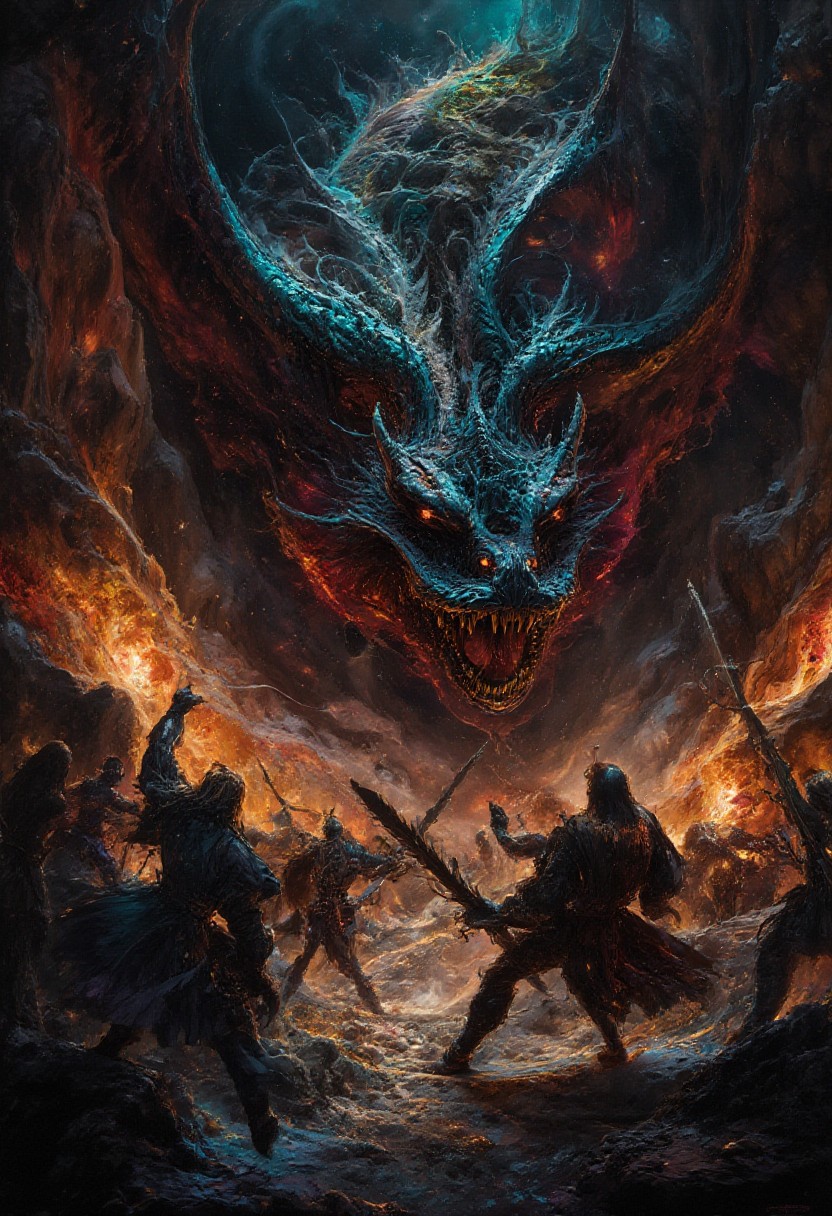 art style by frank frazetta, A fierce battle unfolds in a dark, cavernous setting, dominated by a massive dragon with fiery red eyes and sharp, jagged teeth. It's rough, scaly wings spread wide, and it unleashes a torrent of bright, fiery breath. Surrounding the dragon, warriors in medieval-style armor fight in desperation, wielding swords and shields. Their expressions range from fear to determination, with debris and blood scattered across the ground. Jagged rock formations cast deep shadows, while the dragonas flames and burning torches create an eerie orange glow, enhancing the scene's chaotic, intense atmosphere with realistic textures and dramatic lighting, <lora:dark_fantasy_flux:0.8>, <lora:fluxenhancer:0.6>