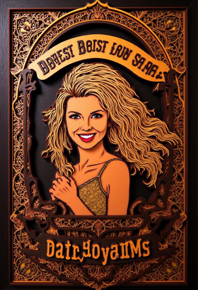 A smiling blonde woman. Blend of post modern hipster byzantine mosaic and anarchist laser cut, layered wood poster style, dark ambience with a golden glow. Laser cut, layered wood, anarchist propaganda poster