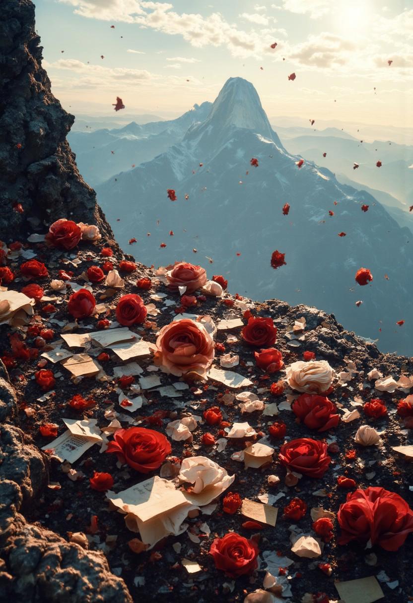 At the very peak of a majestic yet melancholic mountain, a lonely and windswept proposal spot stands as a silent witness to heartbreak. Scattered across the rocky ground are the remnants of rejected love—discarded engagement rings, crumpled love letters, torn photographs, wilted roses, and forgotten velvet ring boxes left open and empty. Some letters are half-buried in the dirt, their ink smudged by past tears, while a few rings gleam under the soft glow of the setting sun, abandoned yet still shining with lost hope. The breathtaking panoramic view of the world below contrasts with the sorrowful relics at the peak, making the scene both romantic and tragic. The sky is painted in soft, dreamy sunset hues, casting golden light over the heartbreak-strewn ground. A faint breeze carries away shreds of love notes, their words fading into the distance. The atmosphere is heavy with longing, unfulfilled love, and bittersweet beauty, as if the mountain itself holds the echoes of lost confessions. A place where love once soared but fell, forever marked by the remnants of dreams that never came true. Cinematic, highly detailed, emotional storytelling, painterly realism, soft lighting, high resolution