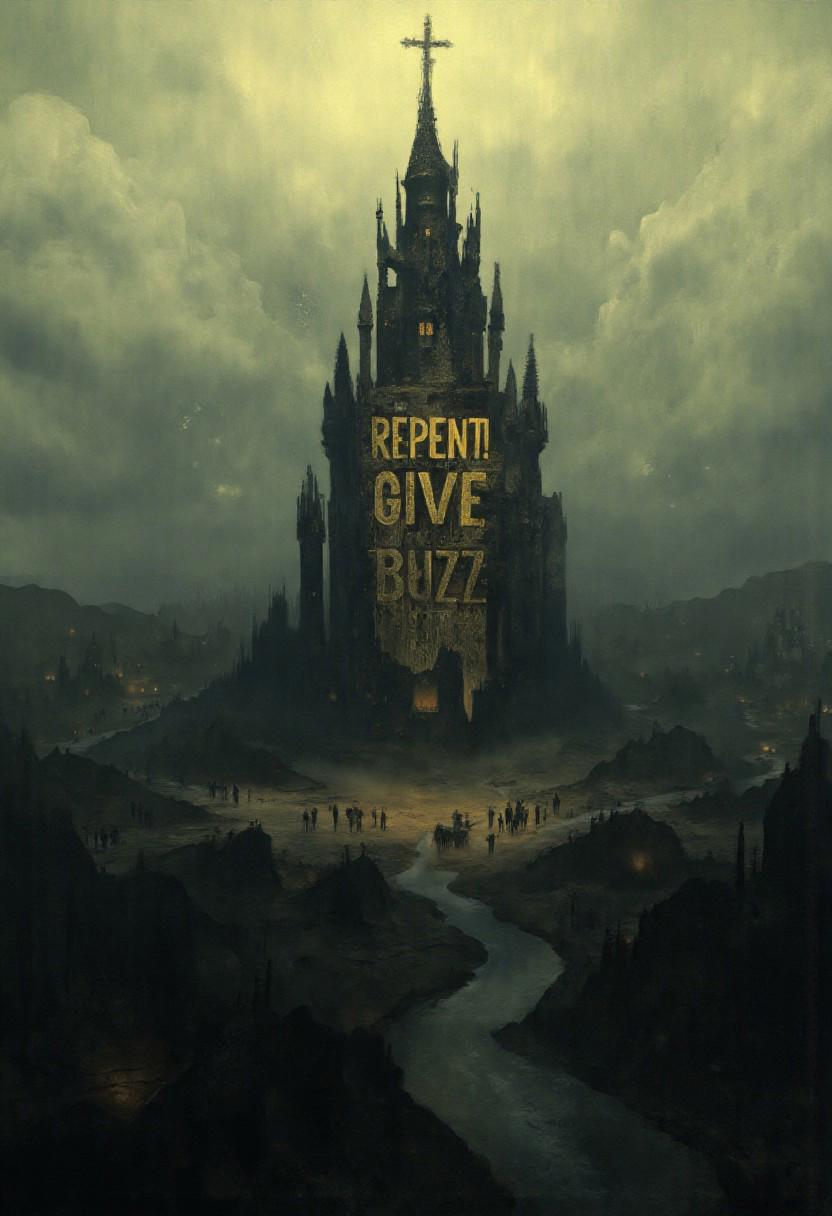 An aerial view reveals a dystopian Constantinople of the future, where a colossal, dark anarchist style skyscraper cathedral dominates the skyline. Its towering structure is adorned with intricate light golden ornaments, shimmering against the bleak golden glimmering cityscape. Atop the cathedral, a massive Greek cross stands as a stark symbol of resilience. A narrow, winding river flows around the base of the cathedral, its reflective waters contrasting with the somber architecture. The scene is rendered in photorealistic detail, capturing the eerie blend of ancient grandeur and futuristic decay, with the city's desolate streets and crumbling buildings stretching into the horizon. Anarchist poster. On the church is written on a big screen in golden letters: "Repent! Give Buzz!"