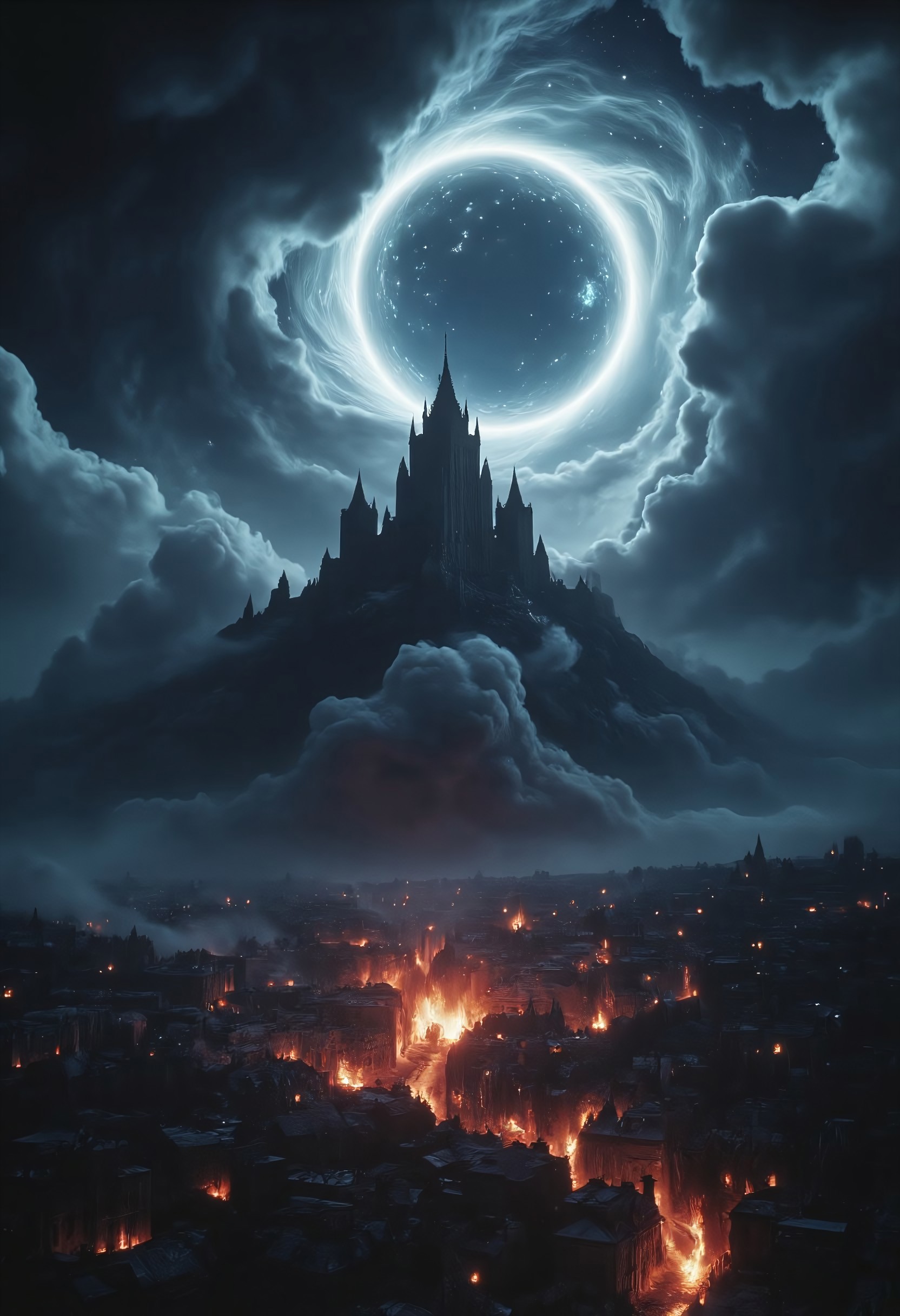 Vaporous, low-hanging clouds hover over a firing castle at night, casting dramatic contrasts between light and shadow. The clouds are thick and swirling, with soft edges that blend seamlessly into the night sky. Above, a complete solar eclipse takes place, the moon fully obscuring the sun, casting a dark, eerie shadow over the castle. The sky is a deep, rich blue, with the stars beginning to shine through the gaps in the clouds. The medieval city below is bathed in soft, warm light from siege fire and burning buildings, but the red ring eclipse brings an unsettling twilight atmosphere, deepening the contrasts in the scene. The clouds move fluidly, their forms ever-changing, evoking a sense of both calm and tension, while the darkened sky adds a vast and ethereal quality to the moment