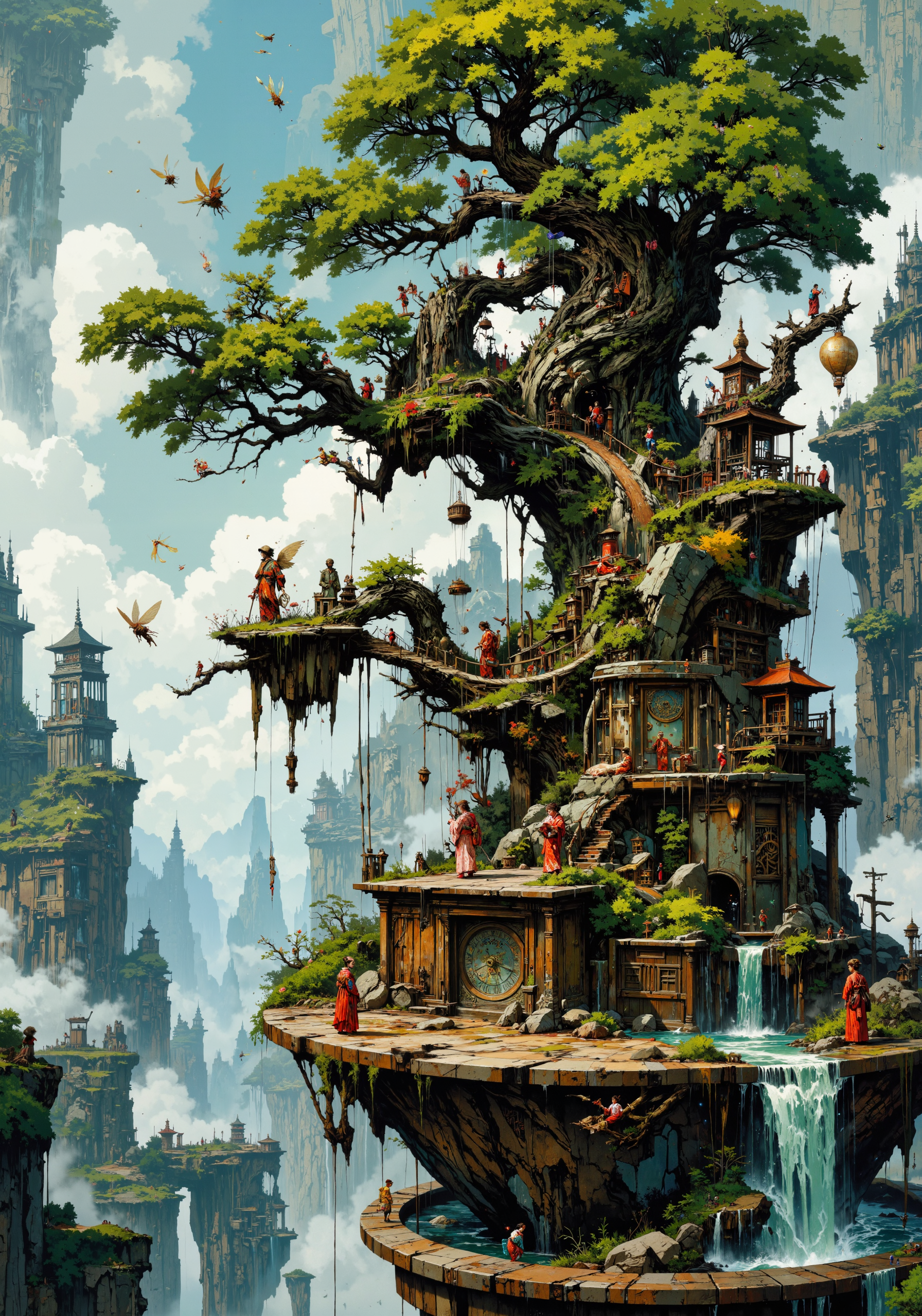 Colossal bonsai trees with intricate, gnarled branches reaching skyward, their miniature landscapes transformed into vast worlds. Tiny explorers in colorful kimonos navigate winding paths and rope bridges between the massive trees. Floating islands of moss and rock hover around the bonsai, connected by delicate chains of flowers. Iridescent fireflies the size of hot air balloons drift lazily through the scene, casting a soft, magical glow. Crystal-clear waterfalls cascade from the bonsai pots, creating misty rainbows. Ornate pagodas and tea houses nestle in the foliage, barely visible amidst the giant leaves. Cherry blossoms the size of parachutes float gently on the breeze. Bonsai-themed clockwork mechanisms tick softly, their gears visible through translucent bark. Surreal, dreamlike quality, rendered in the style of a Studio Ghibli film meets Art Nouveau illustration. 8K resolution, hyper-detailed, ethereal lighting. <lora:Classic_Anime_Colors:0.7> <lora:Illustration_Style_IV:0.1> <lora:boFLUX Double Exposure Magic v2:0.7> <lora:FluxMythP0rtr4itStyle:0.4> <lora:Bruce Holwerda:0.5> <lora:flux_dev:1>
