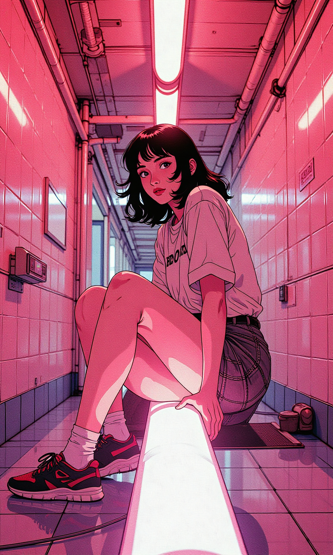 a young woman on a neon pipe in a hallway, in the style of glitch aesthetic, light pink and white, cross processing, schoolgirl lifestyle, eerily realistic, retrowave, medical imaging film BREAK anime, OBdonman, d13s3lp2nk, mad-mdrnmnmlsm, bboil artist style
