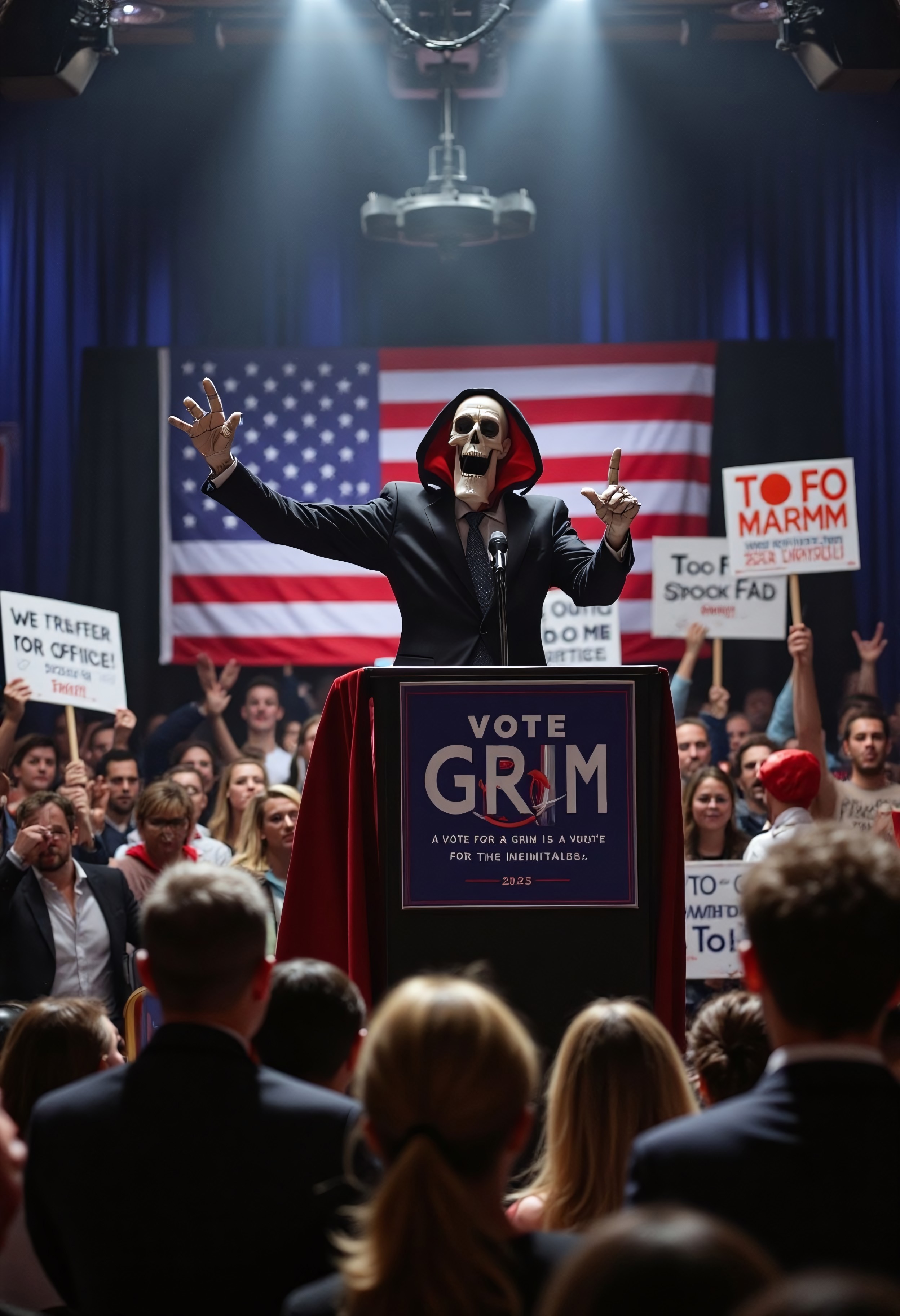A semi-realistic Grim Reaper running for office, standing at a podium with a 'Vote Grim 2025' banner behind him. He’s wearing a crisp suit over his skeletal frame, along with is hood, holding up a bony finger as he passionately addresses a cheering crowd. His campaign slogan: 'A Vote for Grim is a Vote for the Inevitable!' is displayed on the podium. Reporters look nervous, while some audience members hold hilarious protest signs like 'Too Spooky for Office' and 'We Prefer Term Limits!'. Dramatic political lighting, serious yet absurd atmosphere