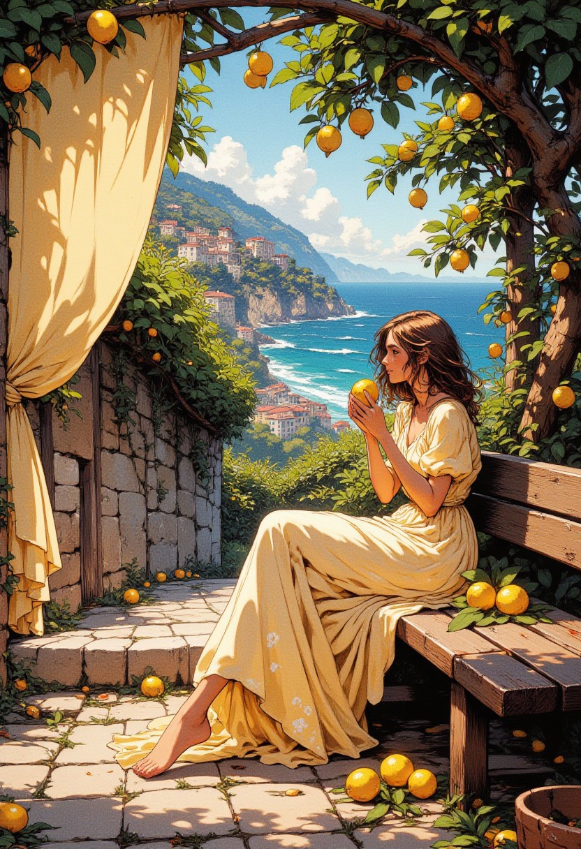 Amalfi Coast Lemon Grove – Pastel Buttercream Yellow Dress "A radiant young woman sits on a rustic wooden bench in a sun-drenched lemon grove on the Amalfi Coast. She wears a flowing pastel buttercream yellow dress with subtle floral patterns, perfectly complementing the vibrant citrus trees around her. A sheer, cream-colored curtain sways with the sea breeze, casting soft shadows on the stone pathway. She holds a freshly picked lemon in her hands, inhaling its bright, refreshing scent as the waves crash against the cliffs in the background."