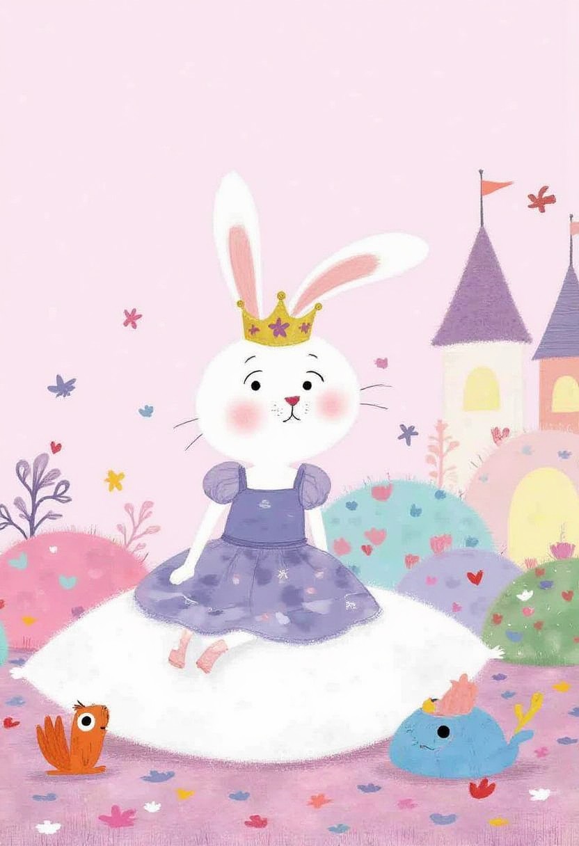 illustration featuring a cute bunny princess wearing a whimsical dress sitting on a large pillow. She looks shy and blushing. The background is a cute and whimsical princess room