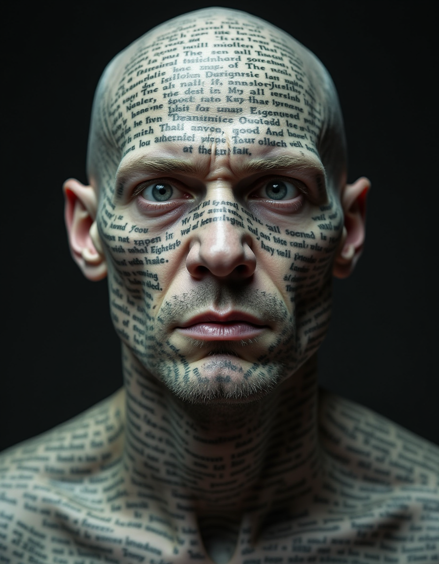 A close-up portrait of a 40-year-old bald man with pale skin and an intense, crazed expression. His entire face, neck, and bald scalp are covered in intricate tattooed lines of biblical scripture. The tattoos are detailed and wrap around his features, creating a striking contrast against his pale skin. The man's wide eyes and unhinged gaze add to the unsettling atmosphere, while the carefully inscribed verses give a haunting, almost surreal, impression of religious obsession.