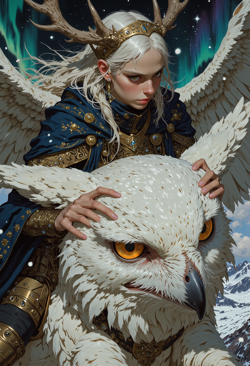 A majestic warrior with long, silver hair and piercing golden eyes rides atop a massive, snow-white owl, its wings spread wide against a breathtaking mountainous backdrop. She wears flowing robes in shades of deep blue, adorned with golden embroidery and intricate arcane patterns. A delicate yet regal antlered crown rests on her head, symbolizing her connection to the celestial winds. Her expression is one of unwavering determination as she grips the owl’s soft yet powerful plumage, guiding it toward the night sky illuminated by glowing auroras. The scene is filled with swirling snowflakes and the cold bite of the high-altitude winds, emphasizing the mystical and grandiose nature of her journey. The owl’s amber gaze is sharp and intelligent, its feathers shimmering with ethereal energy. The composition is highly detailed, cinematic, and atmospheric, evoking a sense of wonder and awe. <lora:FluxMythV2:0.6> <lora:fantastic-realism:0.6> <lora:flux.1_lora_flyway_Epic-detail_v2:0.5> <lora:Anima-Portrait-Midjourney-FLUX:0.7>