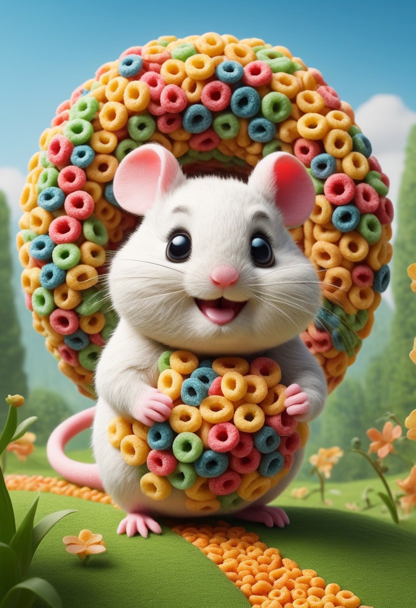 made of fruit loops, (cute , chubby, shortstack,:2) score_9, small mouse running from a snake made of fruit loops