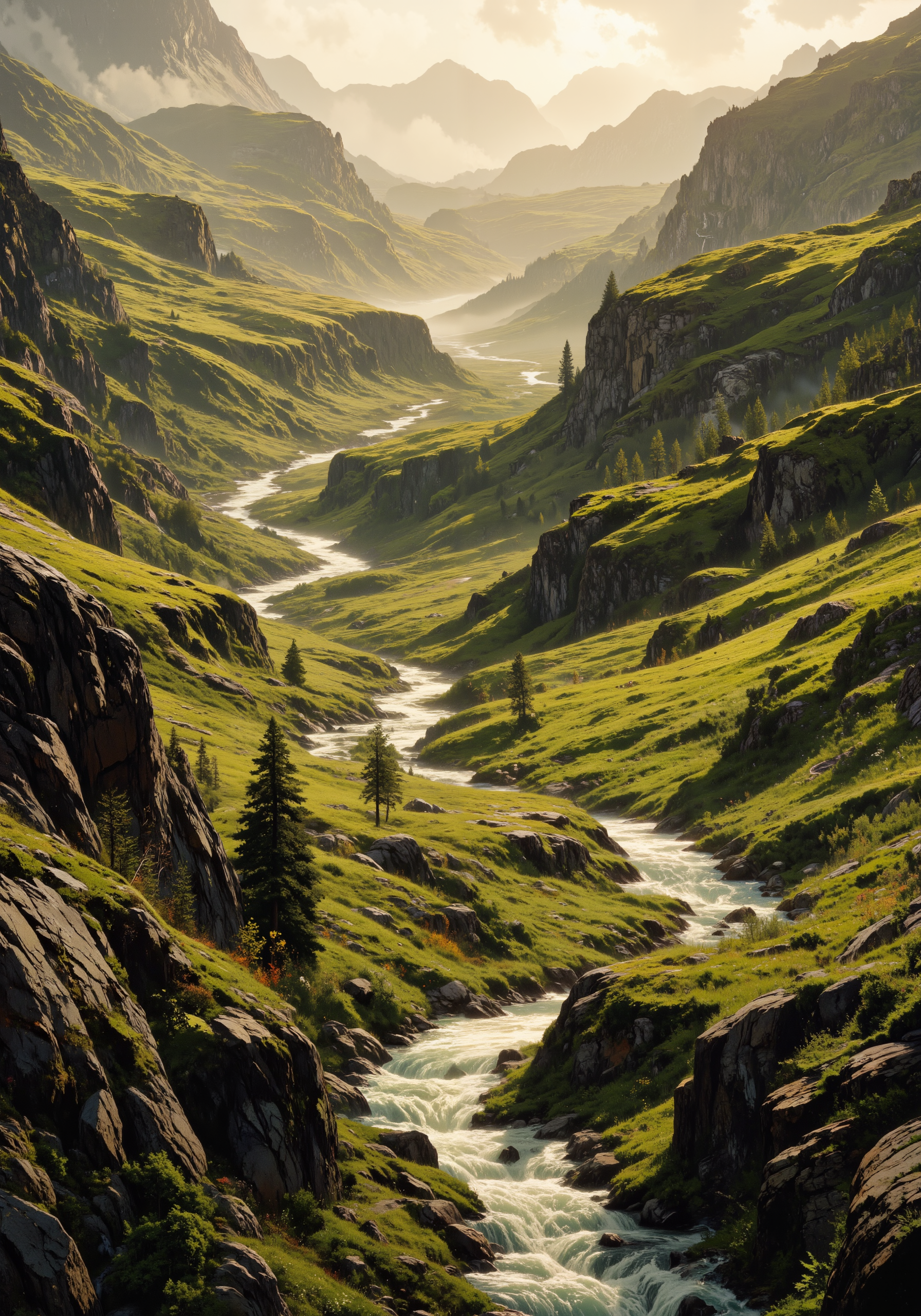 Sweeping aerial view of an ancient inland valley bathed in soft amber sunlight, an intricate river network weaving through lush meadows and rugged rocky outcrops. Emerald forest edges draped with delicate moss textures and dew-kissed wildflowers create an exquisite close-up emphasis, capturing natural gradients and ambient shadows. Detailed, radiant interplay of early morning mist and warm autumn hues, dynamic tracking perspective along winding paths, cinematic spatial composition and intricate natural textures. 8k masterpiece quality, vivid color palette, immersive natural clarity, bold interplay of light and shadow, evocative atmosphere, timeless scenic elegance, and meticulously rendered organic details. <lora:Bruce Holwerda:0.6> <lora:flux_ptchkrawk:0.5> <lora:Classic_Anime_Colors:0.8> <lora:New_Fantasy_CoreV4_FLUX:0.4> <lora:ArtNouveau2Flux:0.6> <lora:flux_dev:1>