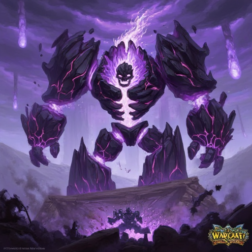 A massive, purple-themed Infernal from Warcraft, its body made of dark, jagged stone with glowing purple cracks of fel energy. It stands in a chaotic battlefield, surrounded by swirling purple flames and fel magic. Its eyes and mouth radiate an intense violet glow, and the sky above is filled with swirling purple clouds and arcane lightning, creating an epic and ominous atmosphere