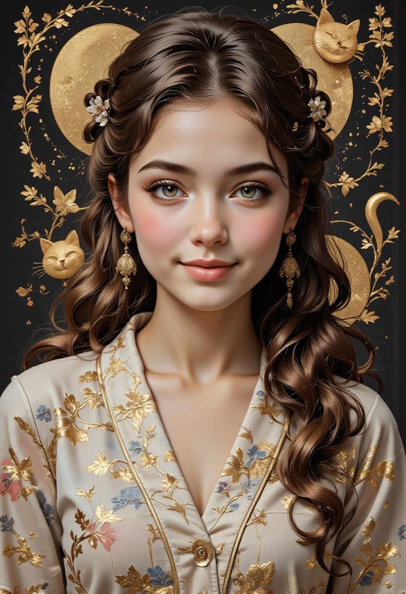 score_9, score_8_up, score_7_up, realistic, petite, (big beautiful eyes:1.2), gorgeous girl, slim body, small perky breast, 8K, Masterpiece, best quality, 1 girl, 25 years, solo, blue eyes, long wavy hair, watercolors, japanese ancient calligraphy in the shape of a cat, dynamic angle, Dutch angle, smile, dark theme, Midjourney style, Anke, Be_luminous, background