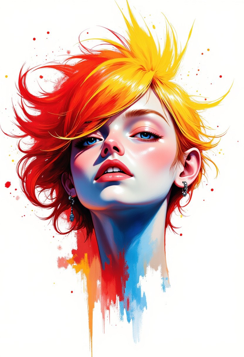 A breathtaking abstract portrait of a woman's face, where bold, expressive strokes of red, yellow, blue, and white collide and merge in a vivid display of artistic intensity. Each hue bursts forth with purpose, forming a striking visual experience that bridges the gap between raw emotion and deliberate composition. The artist's dynamic brushwork—both fluid and aggressive—infuses the piece with movement, as if the very essence of feeling is being captured in color. The subject’s face, though partially obscured by swirling pigments, remains hauntingly expressive, transforming a simple human visage into a kaleidoscope of passion, longing, and depth. The predominantly white background serves as a stark contrast, allowing the vibrant palette to pulse with energy while evoking a sense of dreamlike introspection. Through a refined balance of abstraction and emotion, this piece transcends traditional portraiture, inviting the viewer to interpret the shifting hues as reflections of the multifaceted nature of human experience. del1cate_balance style.