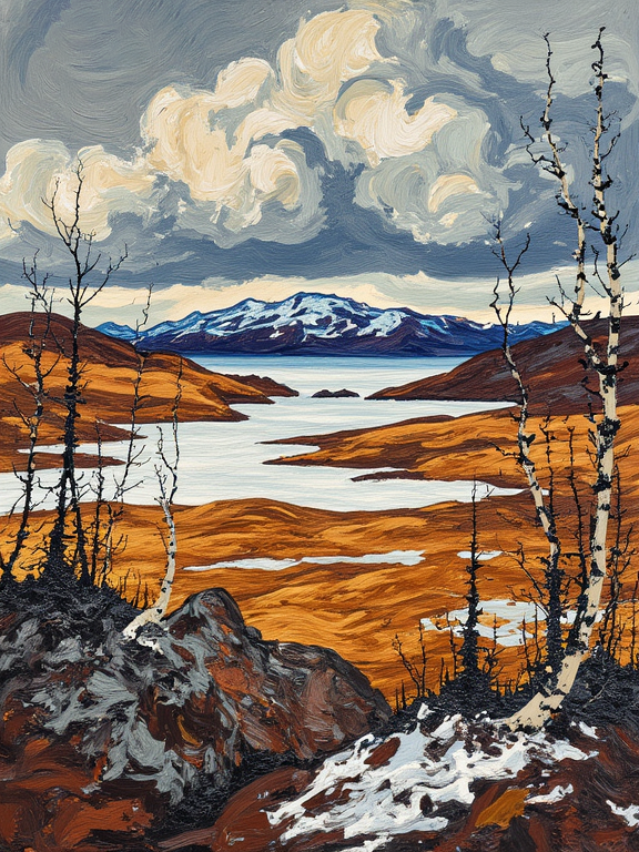 Vibrant Post-Impressionist painting by artist Helmer Osslund. A breathtaking landscape painting in a bold, post-impressionistic style, depicting a vast, rugged terrain with lapporten, rolling hills, icy lakes, and distant snow-capped mountains under a swirling, dramatic sky. The scene is painted in earthy tones of ochre, deep blues, and muted grays, with patches of white snow clinging to the ground. In the foreground, dark jagged rocks and twisted, leafless trees frame the composition, adding depth and contrast. The brushwork is expressive, with visible texture enhancing the raw, untamed nature of the land. The mood is both melancholic and majestic, evoking a sense of solitude and the power of the wilderness. Inspired by Nordic or Romantic landscape painting traditions, with an emphasis on atmosphere and dynamic movement in the clouds and terrain.