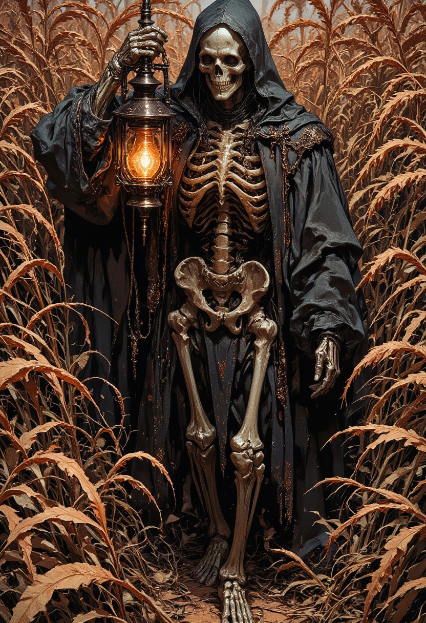 Create a close-up, top-down illustration of a skeleton in mage robes walking through towering brown grass. He holds a old lamp above his face, casting a warm glow that illuminates his detailed, weathered bones and frayed robes. The grass, taller than him, sways gently, with intricate textures and muted tones contrasting the lamp's light. The mood is eerie yet serene, evoking mystery and solitude