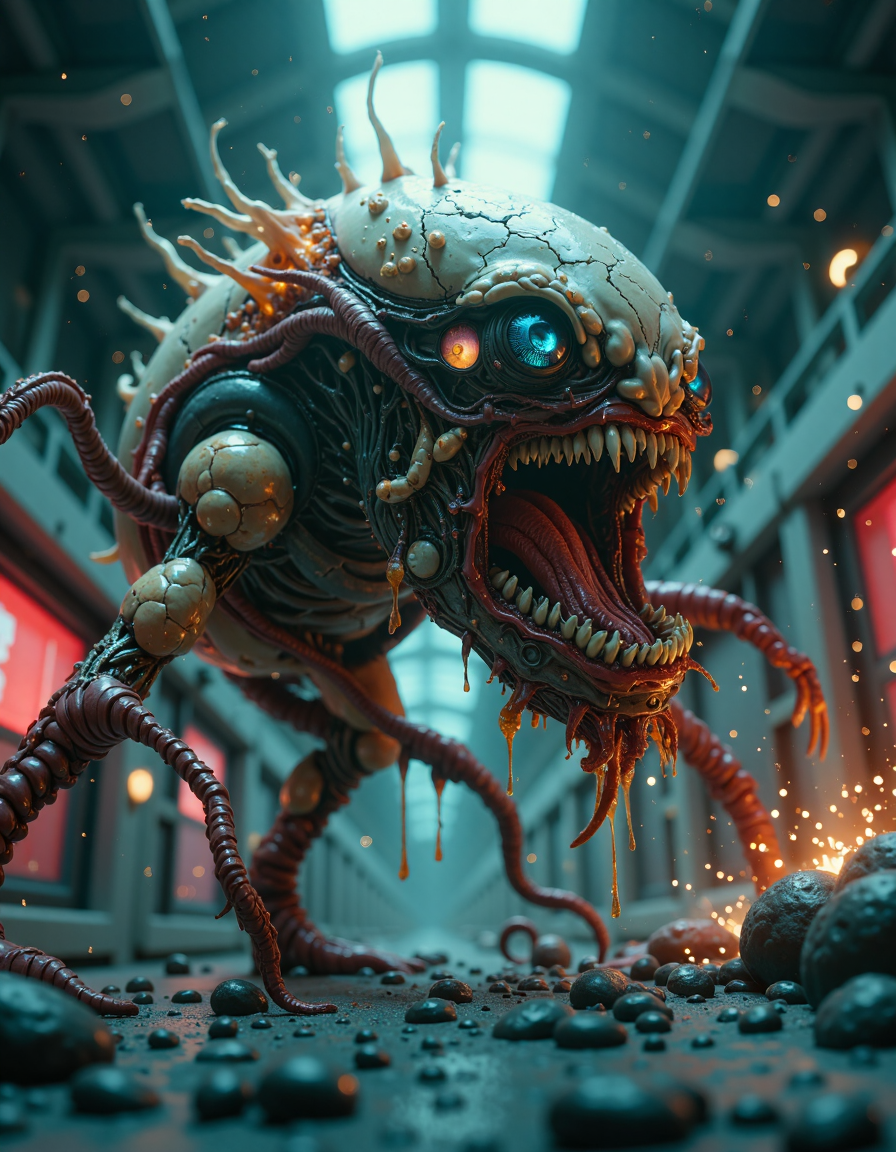 <lora:b10t4c34an-000005:1> hyper-realistic sci-fi fantasy setting, a terrifying demon monster awakens inside a dimly lit biotech experimental lab. The creature's grotesque form emerges from a shattered containment pod, its skin a horrifying blend of molten flesh and biomechanical implants. Glowing red veins pulse beneath its cracked, armored surface, and its eyes burn with a malevolent, otherworldly light. Razor-sharp claws drip with bio-fluid as it lets out a bone-chilling roar that echoes through the sterile, high-tech lab. The lab is in chaos: alarms blare, flickering red lights illuminate shattered glass and overturned machinery, and holographic warning displays flash ominously. Sparks fly from damaged equipment, casting eerie shadows on the walls. The camera focuses on the creature's monstrous featuresâits jagged teeth, writhing tendrils, and the unsettling fusion of organic and mechanical elementsâas it moves with terrifying, predatory grace. Smoke and steam rise around it, adding to the surreal, nightmarish atmosphere. The scene captures the horror and awe of this unholy creation breaking free.