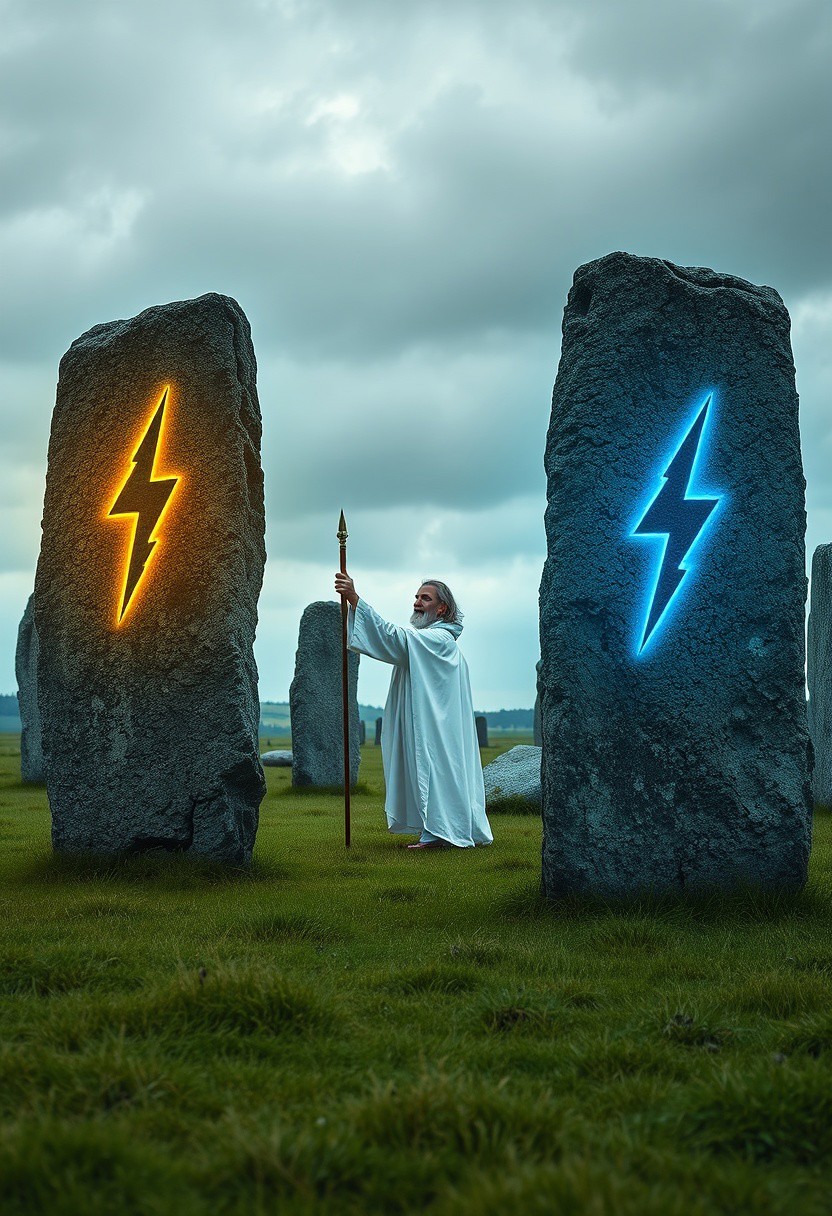 A realistic photograph of a field in England or Ireland, with standing stones like Stonehenge. A druid with a staff wearing a white robe is standing between two of the standing stones. One stone has a carving of a symmetrical lightning bolt symbol on it, and the symbol is glowing yellow. The second standing stone also has an identical lightning bolt symbol that is glowing blue. The druid is reaching out toward the yellow symbol.