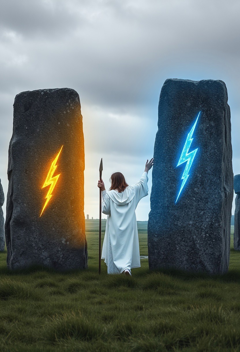 A realistic photograph of a field in England or Ireland, with standing stones like Stonehenge. A druid with a staff wearing a white robe is standing between two of the standing stones. One stone has a carving of a symmetrical lightning bolt symbol on it, and the symbol is glowing yellow. The second standing stone also has an identical lightning bolt symbol that is glowing blue. The druid is reaching out toward the yellow symbol.