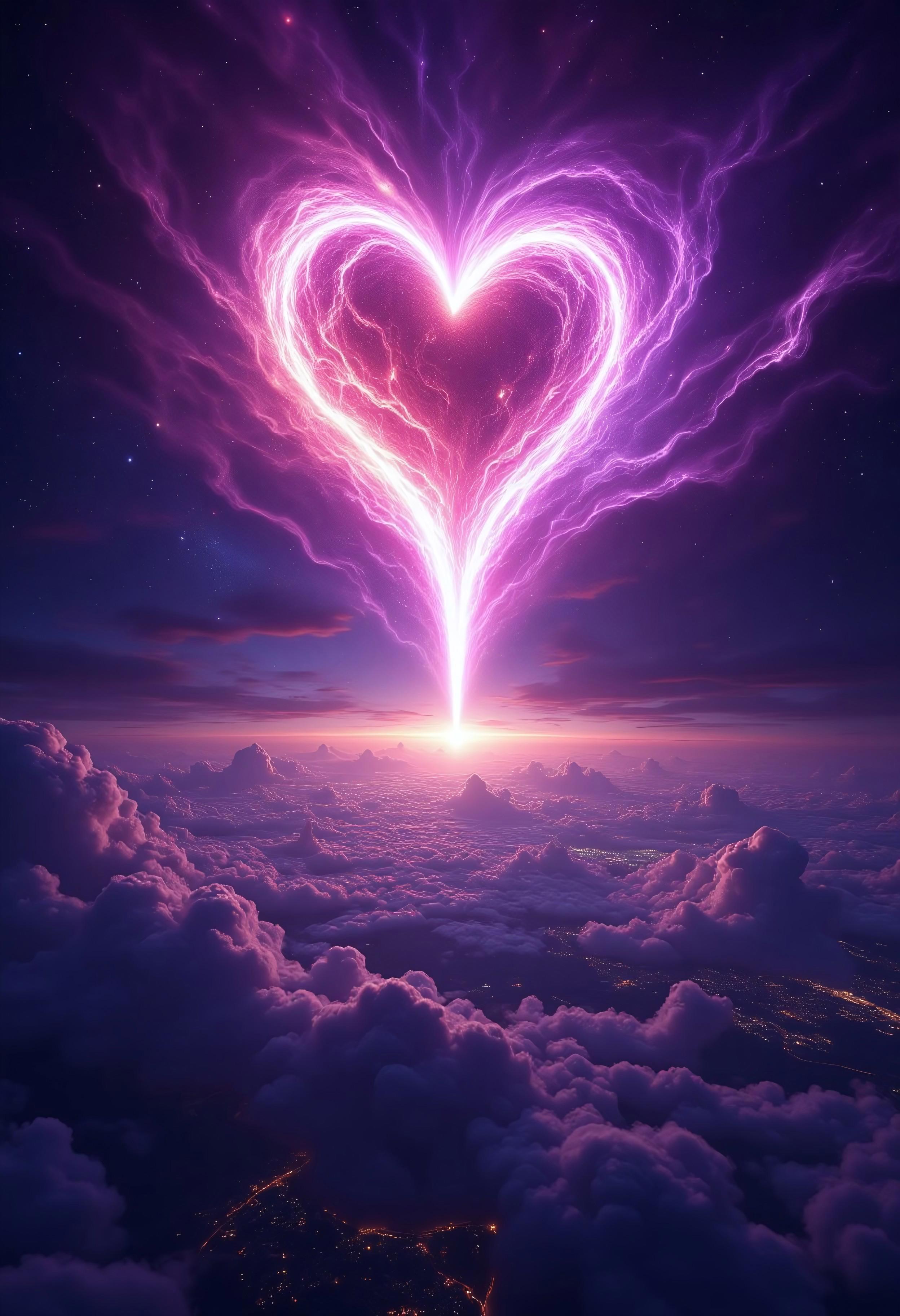 An epic, cinematic scene of a massive, glowing heart-shaped comet hurtling through the night sky towards Earth. The comet is radiant, with a fiery core of deep pink and purple hues, surrounded by a shimmering, ethereal aura. Its long, flowing tail leaves a vibrant trail of sparkling purple and pink light, illuminating the darkness like a cosmic brushstroke. The Earth below is partially visible, with city lights twinkling like stars and a faint, glowing atmosphere hinting at the impending impact. The sky is filled with swirling clouds, stars, and a sense of awe-inspiring scale. The scene is both breathtaking and dramatic, capturing the beauty and power of this celestial event. The lighting is intense, with the comet casting a surreal glow across the landscape, creating a sense of wonder, urgency, and epic grandeur