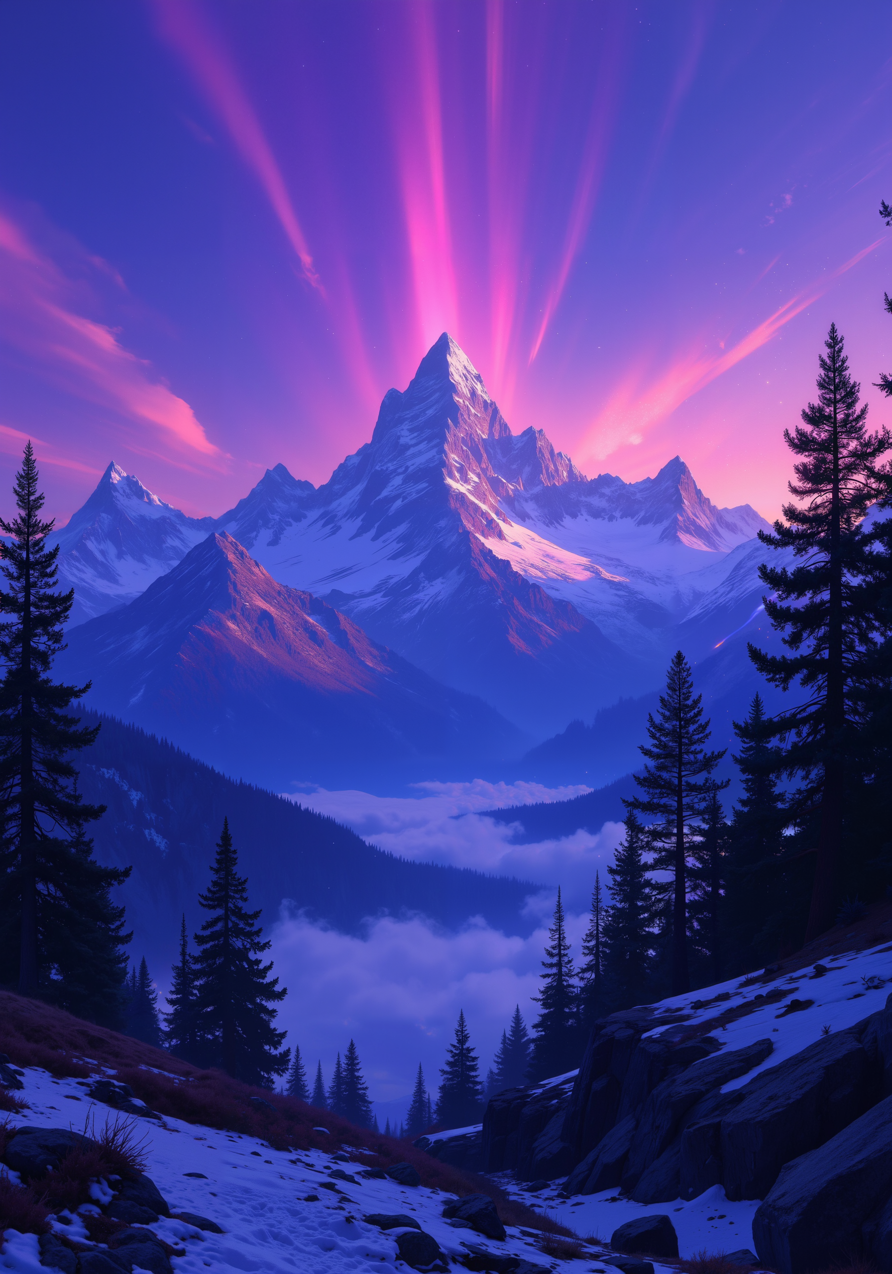 Majestic alpine range, expansive mountain terrain bathed in ethereal twilight radiance. Low-angle perspective reveals intricate textures of rugged rock faces, delicate snow patches, and drifting mists. Vibrant aurora streaks illuminate cascading peaks, enveloping ancient pine silhouettes in shimmering purple and orange hues. Hyper-detailed 8K masterpiece, atmospheric interplay of subtle shadows and luminous gradients. Sweeping panoramic view, dynamic composition capturing cosmic wonder and timeless serenity. <lora:Rainbow_on_black_style-000003:0.1> <lora:NeonFantasyPrimeFLUX-000049:0.5> <lora:artisketchyfs-v02:0.3> <lora:Bonafida.Studio:0.1> <lora:flux_dev:1>