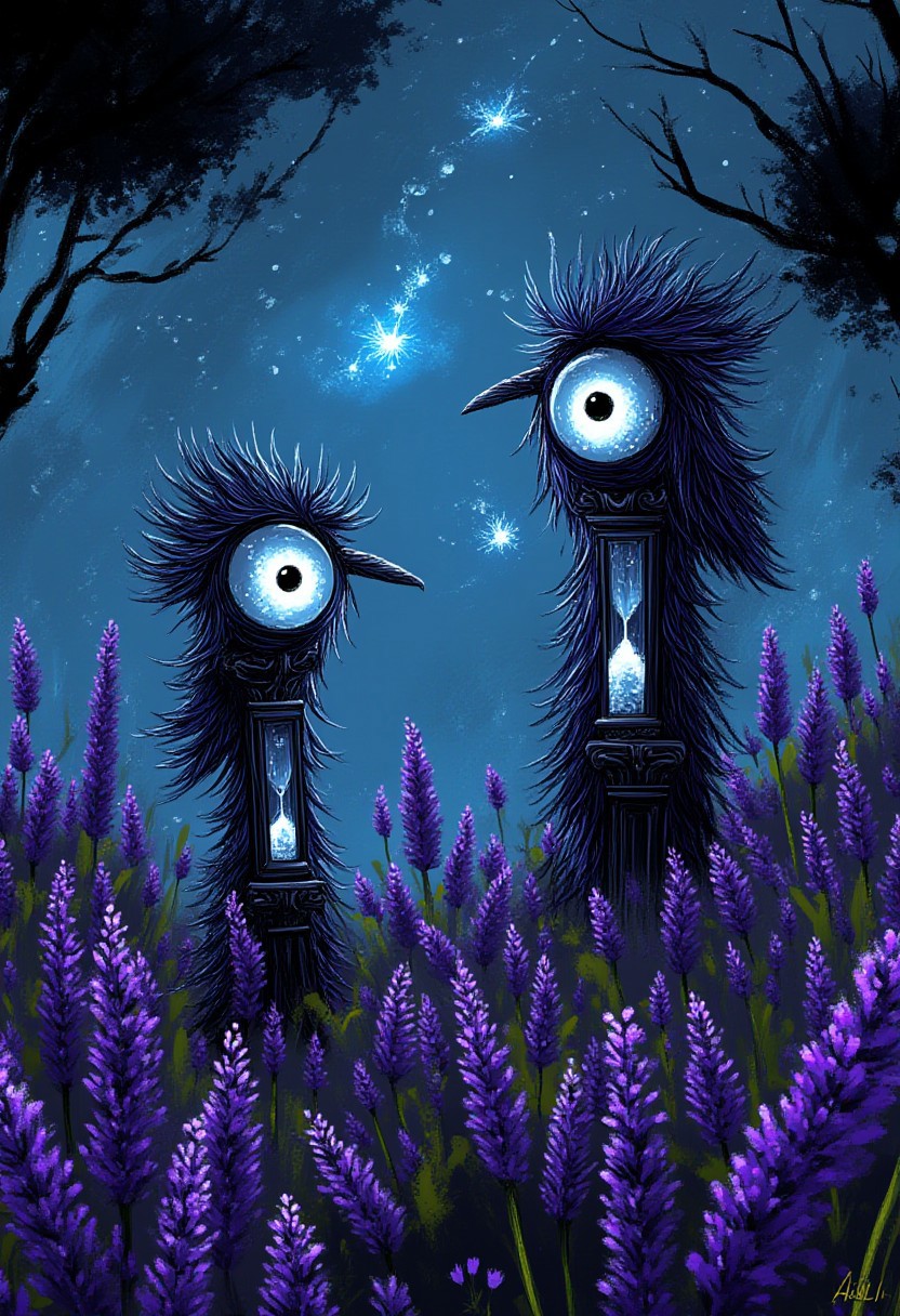 A whimsical illustration of elongated ravens with enormous moonstone eyes that hold ancient secrets in dark whimsical art style, perched on twisted grandfather clocks while measuring time with hourglasses made of starlight, their impossibly long feathers flowing like liquid shadows, digital painting with mystical brushstrokes showing iridescent black feathers catching moonlight, purple lavender and glowing blue cornflowers growing through the clock gears, twilight meadow background with floating timepieces, characteristic Tim Burton inspired design with the ravens' eyes reflecting past and future in swirling patterns