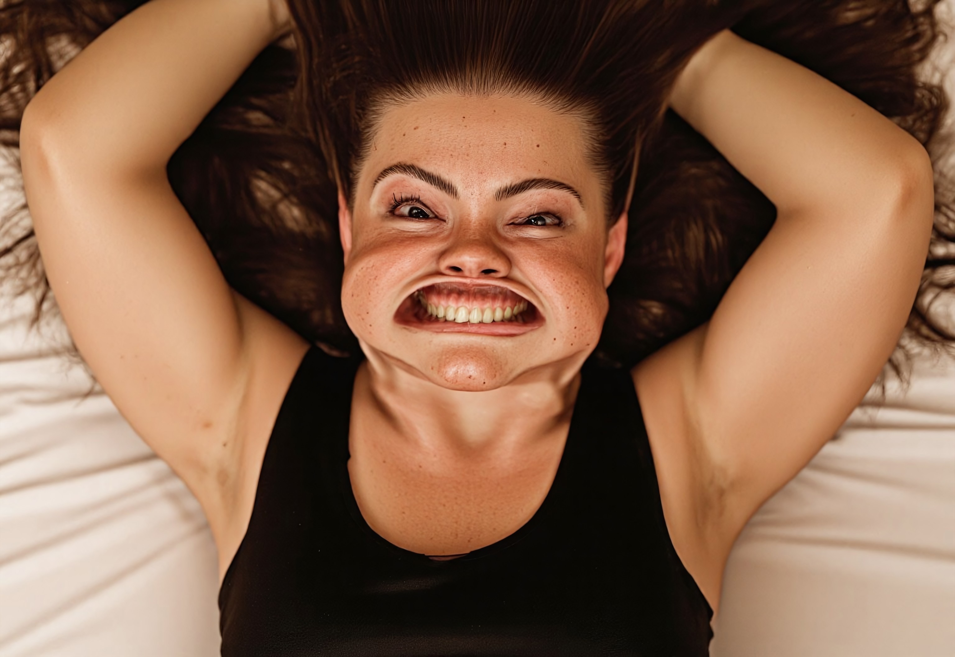 A medium shot photograph of a curvy woman with medium length curly hair standing laying down submissively in bed. hotel scenery. Night time, warm lighting. She has curly brown hair, lots of freckles on her nose and forehead, and brown eyes. She is wearing a black silk nightgown. She has medium sized breasts that are very saggy. She has wide nostrils and a beautiful large smile. sultry lips. w1nd8l0wn photo of a squinting woman's perfect teeth. windy. She is wearing glossy red lipstick. big wide open mouth. stretchy flappy lips fully exposing gums and teeth. She is laying down in bed on a pillow. She has her arms above her head and to her sides in a submissive sexual pose. realistic. high-definition. She has a defined jawline and defined eyebrows. large bust. oval rectangular shaped head. si1k. sa1in. forehead freckles. nose freckles. flirty.