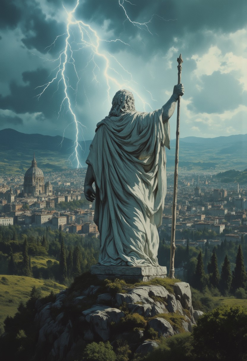 (masterpiece), best quality, drone shot, wide shot, far away, A gigantic marble white statue of Zeus holding a lightning bolt staff towering over a large city on plain grassy land, roman soldiers at the base, ancient Rome, Thunder storm, Cinematic, Perfect hand,absolute reality,retro aesthetic,analog photo,moody, lightning flash highlights