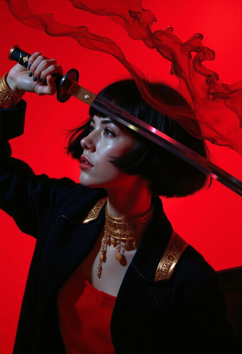 A hyper-detailed, hyper-realistic painting infused with modern surrealism, inspired by Donna Young and Minrill, depicting a woman with short black hair in a floating French bob, exuding an ethereal yet unsettling presence. Her hollow, pupil-less eyes gaze upward beneath long, dark bangs, her expression vacant and haunting. She is adorned with intricate Egyptian-inspired golden ornaments and avant-garde fashion, wearing a Japanese school uniform beneath an oversized dark overcoat, enhancing the eerie contrast. In mid-motion, she draws a gleaming katana, droplets and fine crimson mist elegantly arcing outward, frozen in time. The crimson mist contrasts against a deep red gradient background, amplifying the surreal atmosphere. Shot from a high-angle perspective with a 100mm virtual prime lens at f/2.8 aperture and ISO 50, the shallow depth of field enhances the dreamlike quality. Dramatic shadows and fine grain add texture, with Junji Ito-inspired unsettling aesthetics heightening the sense of suspense. 8K, HD, HIGH RESOLUTION, MASTERPIECE, AWARD WINNING.