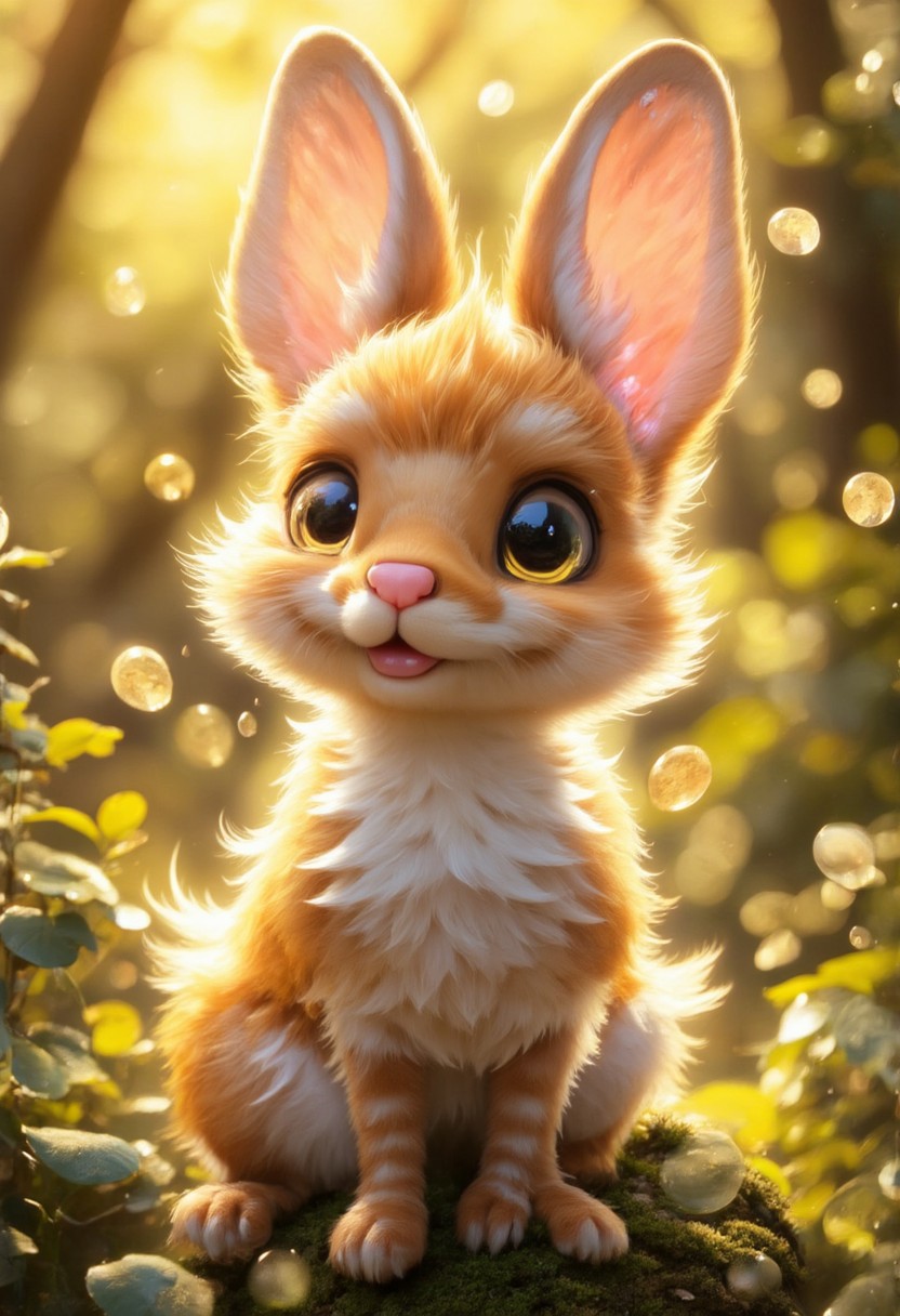 A heart-meltingly cute hybrid creature, the Fennec Bunki, blending the most adorable features of a fennec fox and a baby bunny. This tiny, fluffy being has oversized, velvety ears that perk up with curiosity, their soft pink interiors glowing subtly in the golden sunlight. Its round, sparkling eyes are filled with playful innocence, while its tiny button nose twitches as it sniffs the air. Its fur is an exquisite blend of warm sandy tones and pure snow-white patches, impossibly soft and slightly tousled. The Bunki's delicate little paws rest on a mossy rock as it stands on its hind legs, exuding an irresistible charm. A fluffy, cotton-like tail flicks gently, adding to its lively personality. Set in a magical forest glade, soft golden light filters through the trees, illuminating the dewdrops on nearby leaves. Ultra-detailed, cinematic lighting, photorealistic fur texture, expressive eyes, cozy and whimsical atmosphere.*
